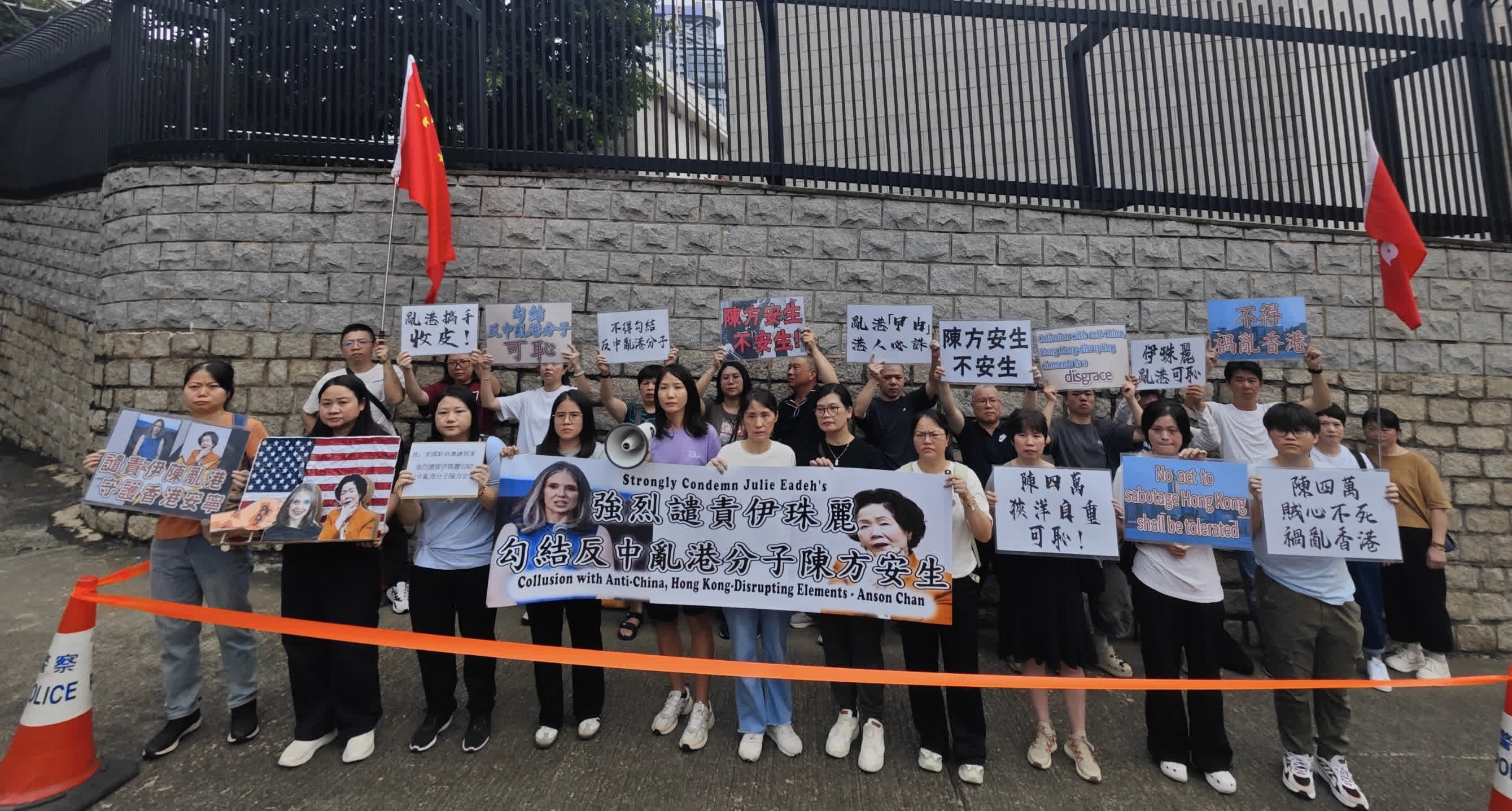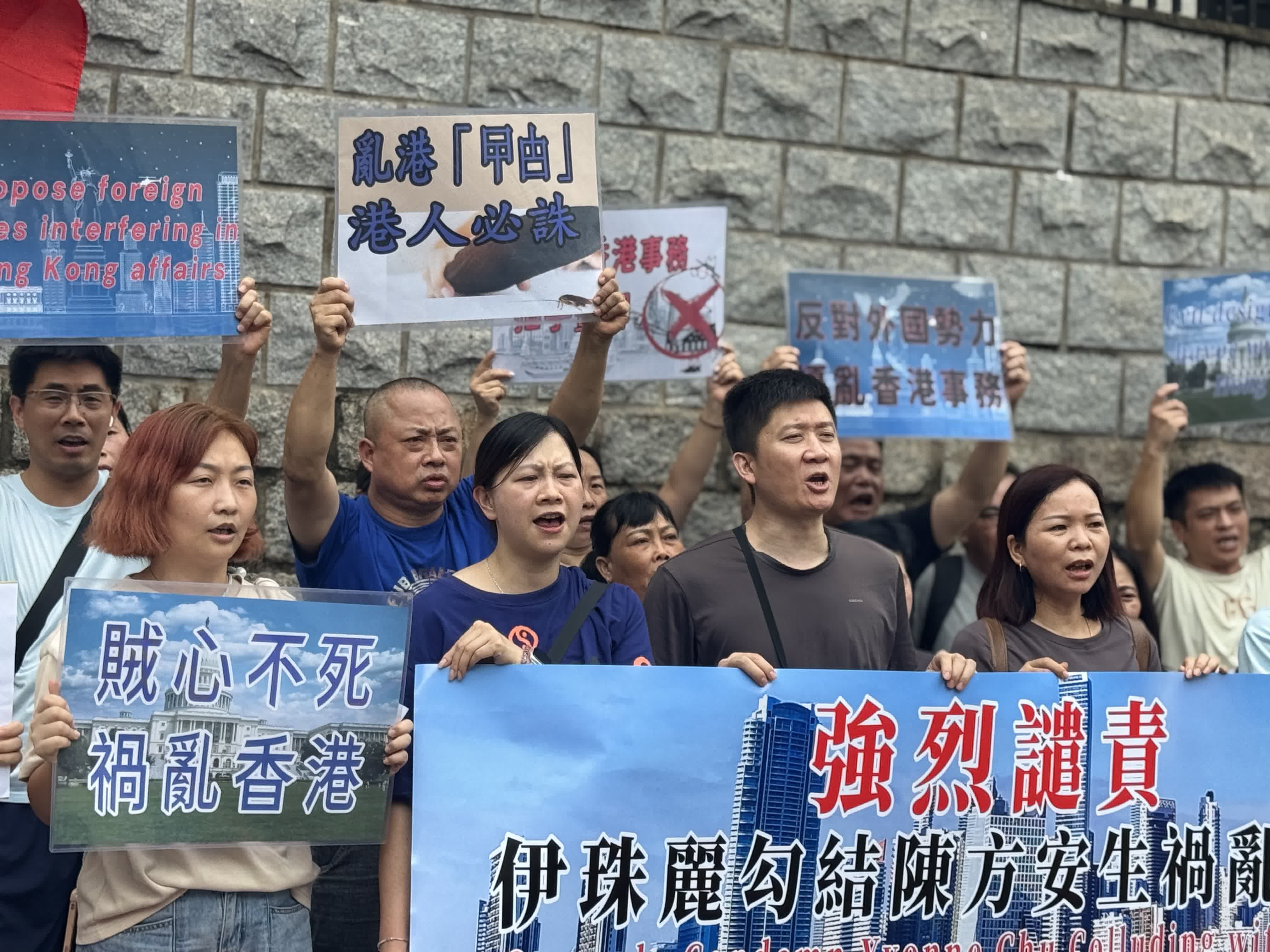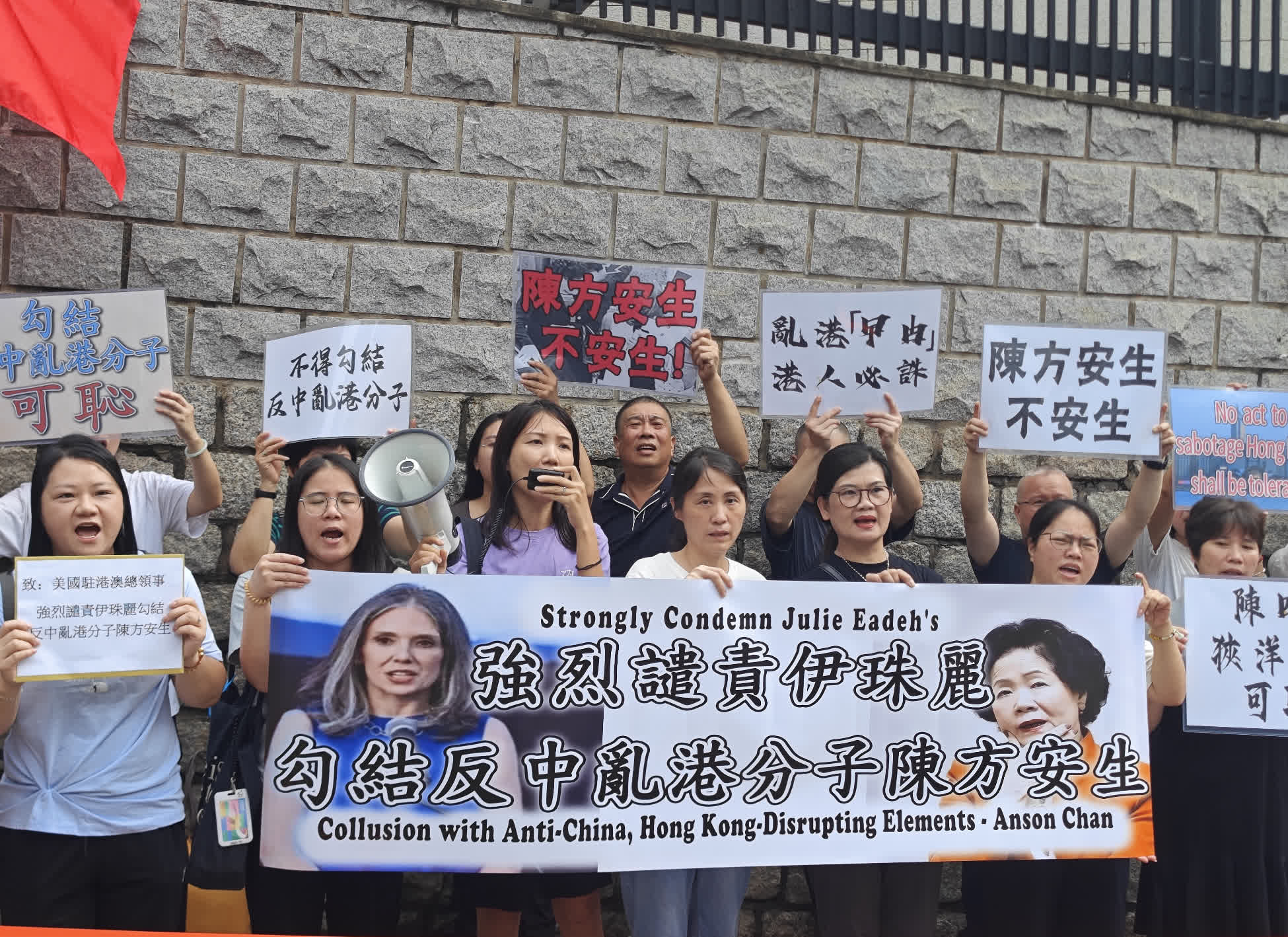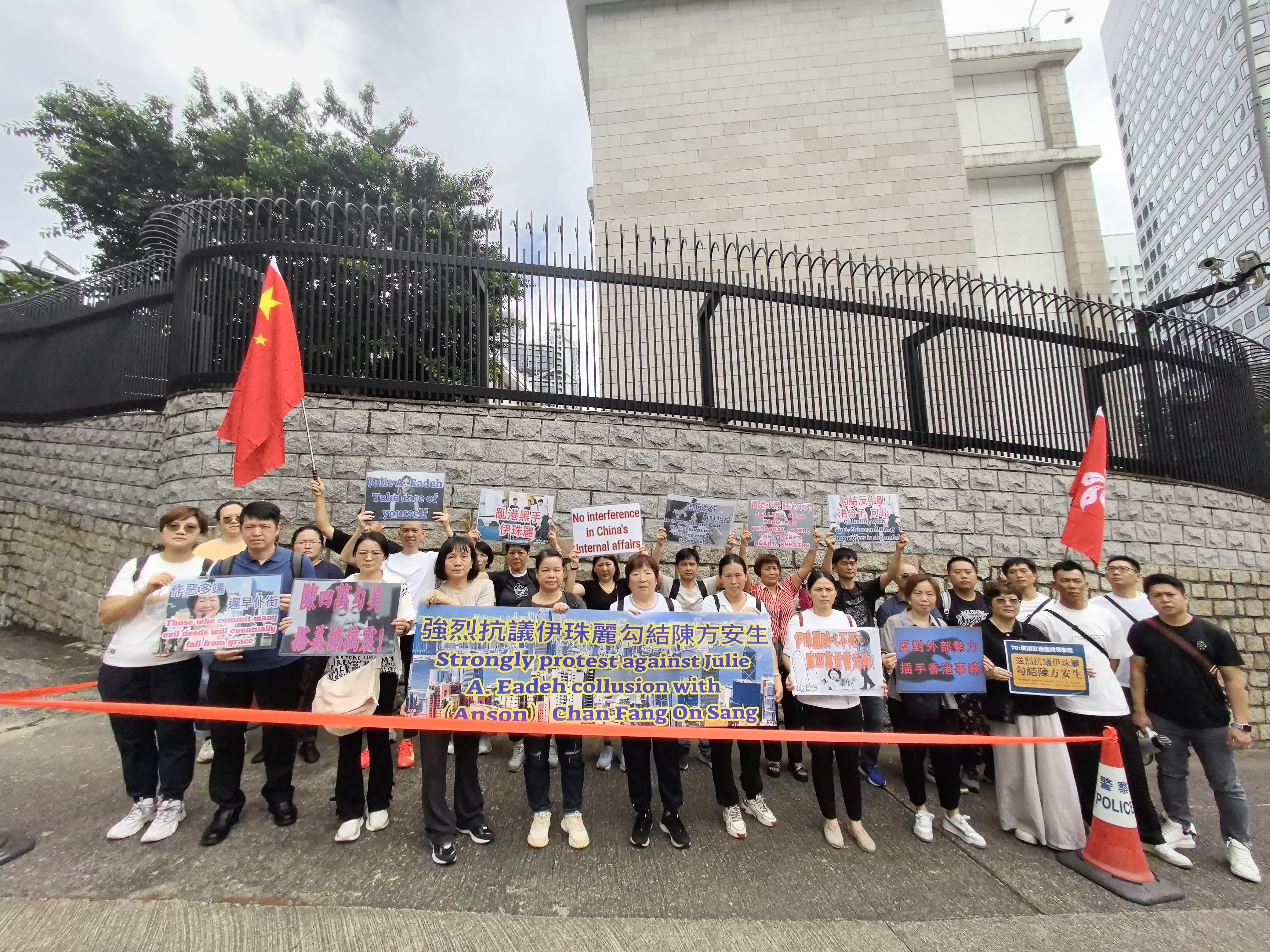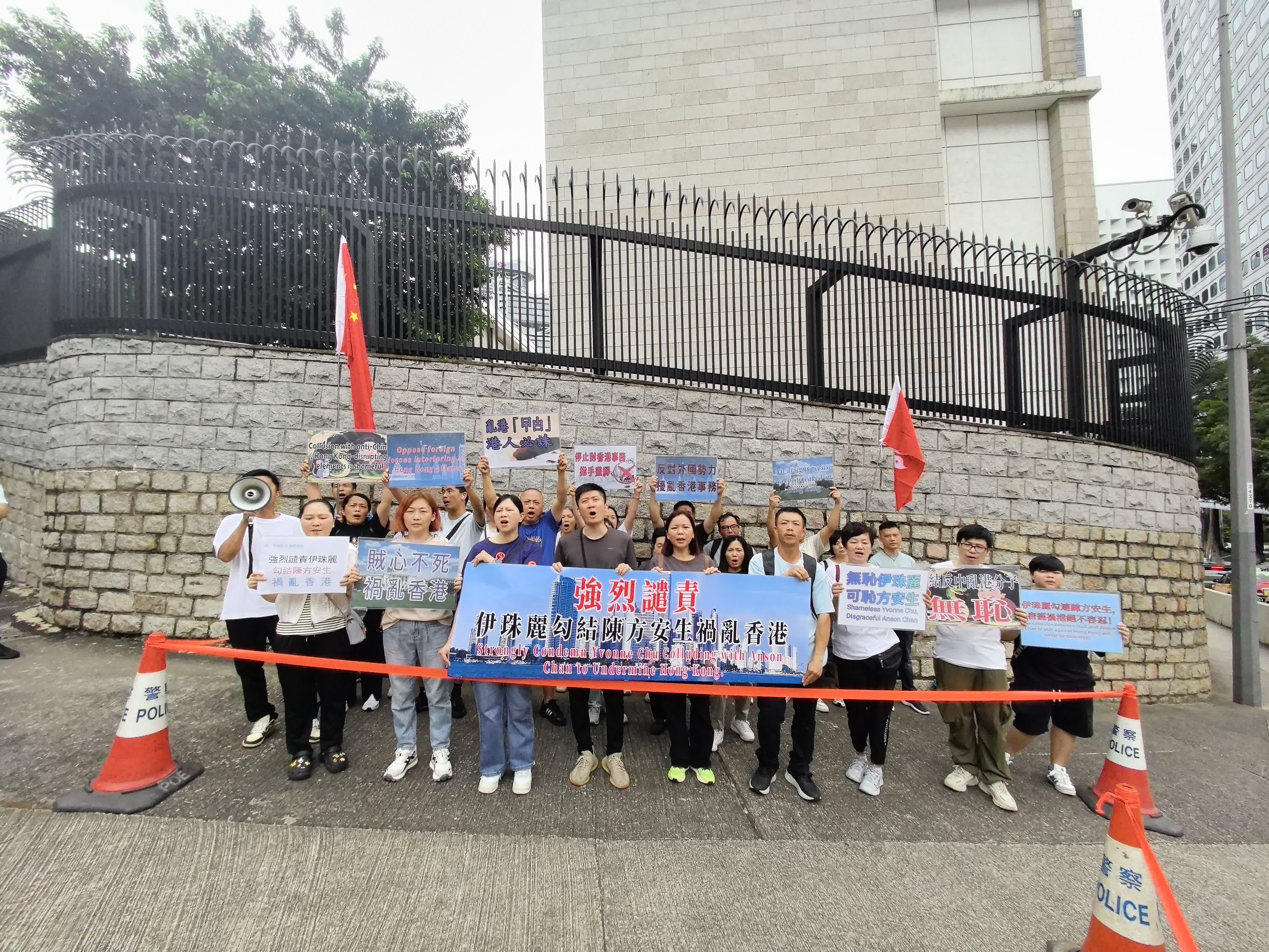 今日(23日)上午有市民團體前往美國駐港澳總領館抗議,強烈譴責美國駐港澳總領事伊珠麗勾結陳方安生禍亂香港。