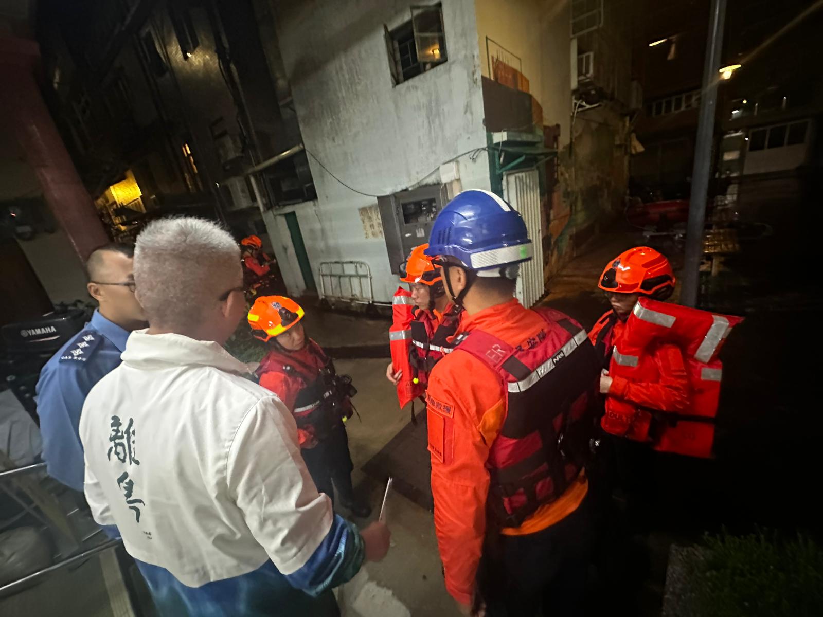 十號颶風信號現正生效。24日早晨七時許,位於大澳鄉事委員會臨時指揮中心的各個救援隊伍正在集結,準備前往大澳永安街、太平街等地轉移受影響災民,指揮官在傳達任務時強調:「如果災民有寵物,可以一起帶走!」