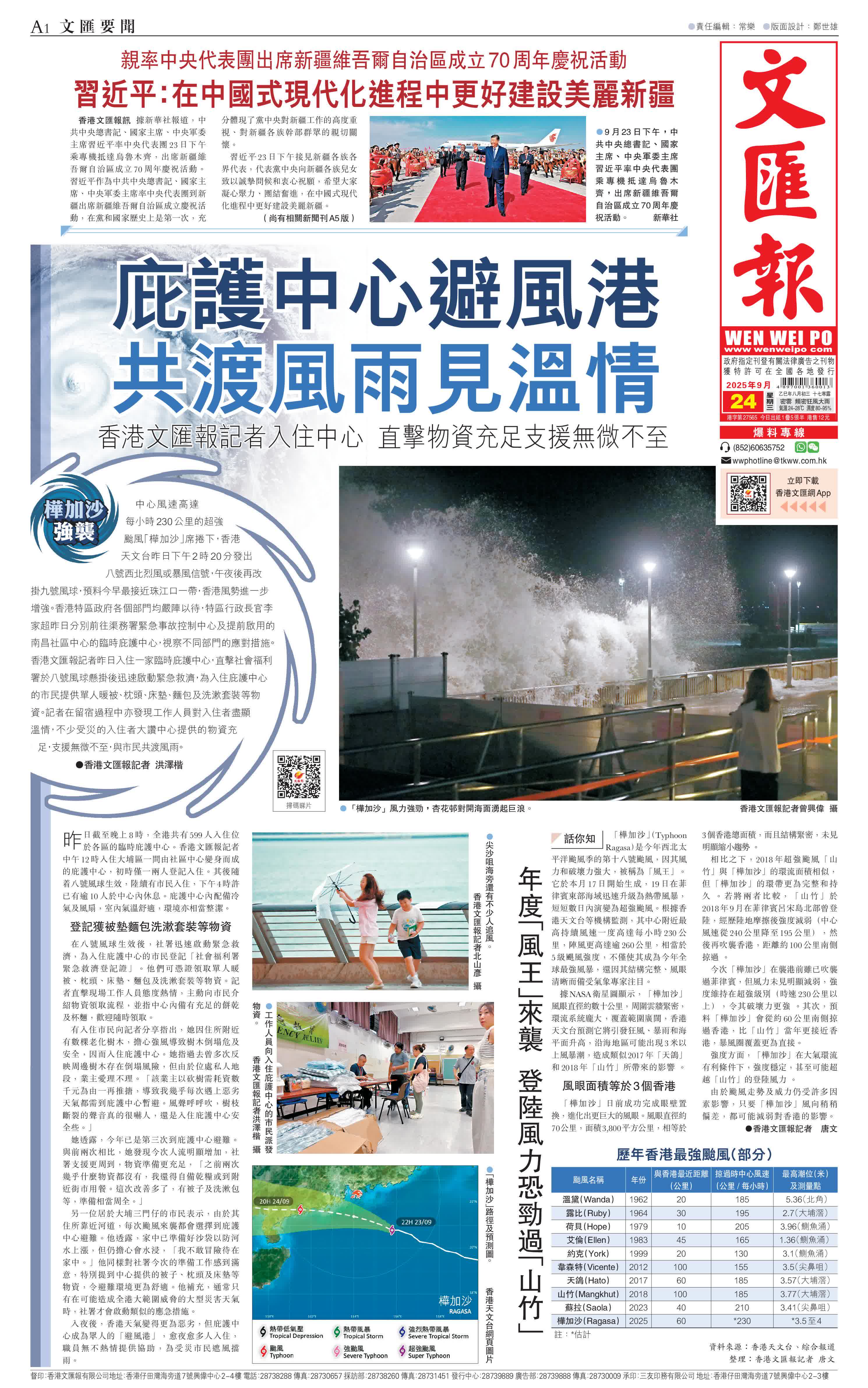 (香港文匯報記者 唐文)「樺加沙」(Typhoon Ragasa)是今年西北太平洋颱風季的第十八號颱風,因其風力和破壞力強大,被稱為「風王」。它於本月17日開始生成,19日在菲律賓東部海域迅速升級為熱帶風暴,短短數日內演變為超強颱風。根據香港天文台等機構監測,其中心附近最高持續風速一度高達每小時230公里,陣風更高達逾260公里,相當於5級颶風強度,不僅使其成為今年全球最強風暴,還因其結構完整、風眼清晰而備受氣象專家注目。