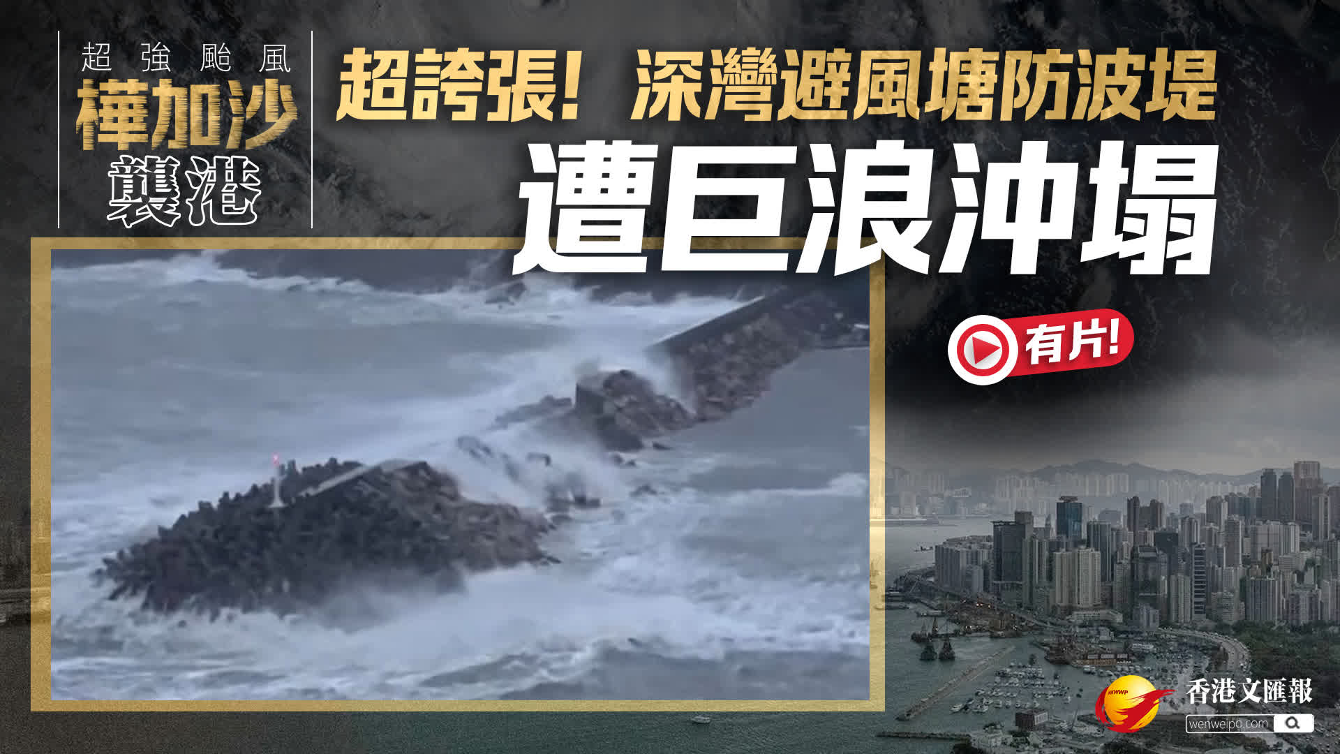 香港文匯報訊(記者 蕭景源)超強颱風「樺加沙」襲港,天文台今日(24日)凌晨2時40分發出十號颶風信號,樺加沙所引發的風暴潮下,多區沿岸遭巨浪造成破壞;有網民拍攝到深灣避風塘防波堤疑不抵巨浪拍打,避風塘對開一段防波堤被巨浪沖塌損毁,幸停泊在避風塘內的船隻未有受太大影響。
