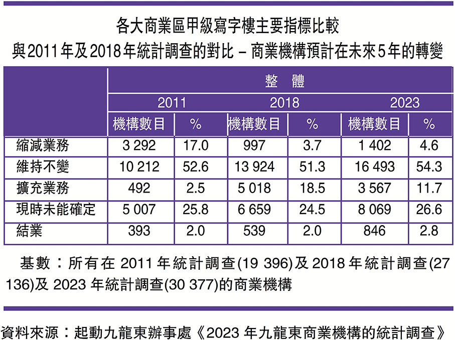 該報告指出,九龍東CBD2的商業樓宇面積從2011年的170萬平方米,增加至340萬平方米,連同正在興建或已獲批的項目,商業樓面面積約有400 萬平方米,與中環核心商業區的商業樓面面積相若。租金便宜是九龍東CBD2的最大優勢,29.2%企業租金不足1萬元港幣。數據顯示,現時九龍東區域內有逾3萬間企業,其中,以進出貿易及批發和零售業為主,佔35%;其次為地產以及專業及商業服務,以及銀行金融服務和保險業,分別佔14.1%和9.3%。除上述行業外,區內資訊科技和藝術文創產業佔比亦不低,分別佔6.2%和5.8%。