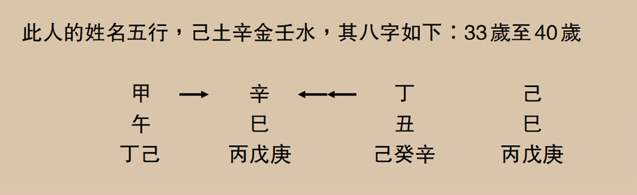 其他與他相識的朋友,都說他有情緒問題。他的姓氏己土,希望有人看得到自己的付出,而八字有丁火己土之人,是有修道緣分之人,一般人難理解他喜愛思考人生的抽象價值,與世俗人的價值觀不同,所以難有知音。現基因大限行至33歲至40歲的時限,即引發丁火剋辛金的基因特性,於是邏輯混亂加上強甲反剋辛金,更形成多憂的壓力情緒!