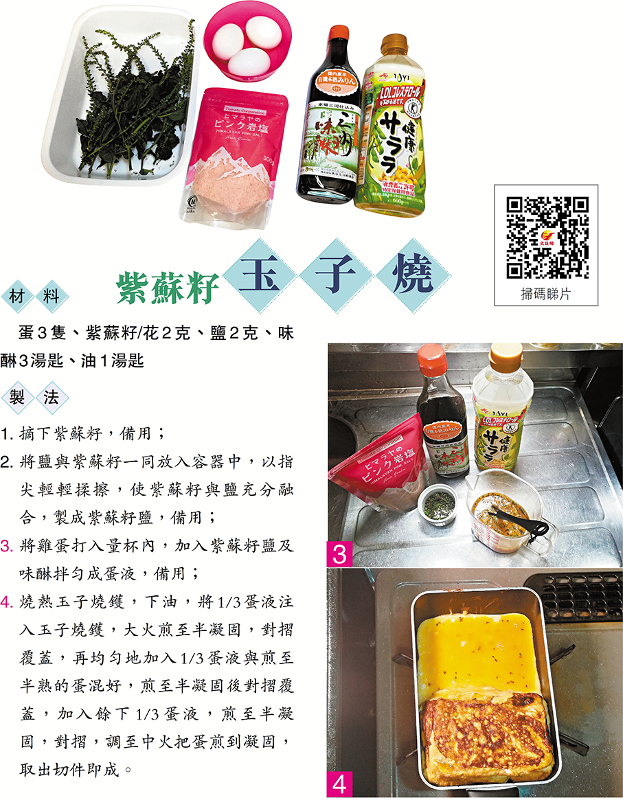 此外,紫蘇富含β-胡蘿蔔素與維生素C,有助於強化皮膚與黏膜,提升身體抵抗力﹔紫蘇所含的紫蘇醛等香氣成分,能刺激嗅覺神經,促進胃酸分泌,增進食慾,同時也具有抗菌作用。