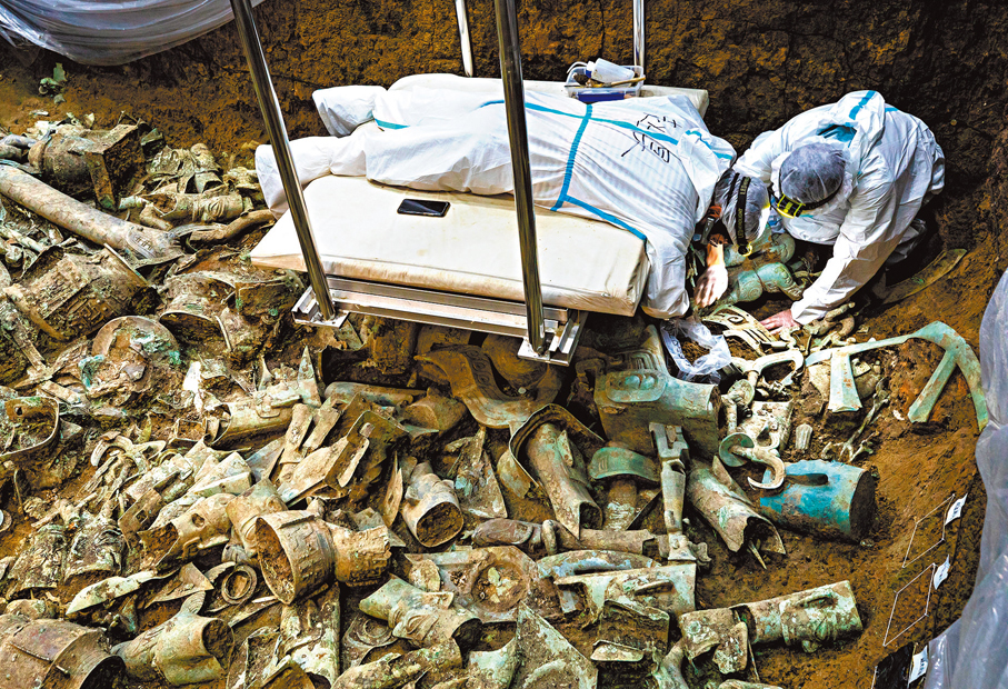 三星堆遺址祭祀坑年代備受各界關注。經四川省文物考古研究院和北京大學聯合研究,通過碳十四年代測定,三號、四號、六號、八號祭祀坑埋藏年代有95.4%的概率處於公元前1201年至公元前1012年,相當於商代晚期。一、二、三、四、七、八號坑中發現可拼對的同一器物殘片,表明埋藏年代相同。該成果為釐清祭祀坑年代和構建遺址精細年代框架提供了重要依據。