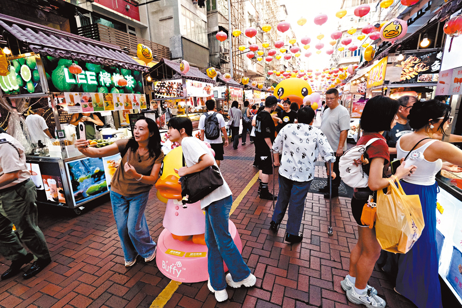 活動啟動禮昨日在三地同步舉行。其中,香港的廟街現場特別引入「B.Duck 在廟街」展覽,將傳統中式牌樓閣樓與潮流IP小黃鴨巧妙融合。遊客不僅可以細賞中華文化韻味,還能與可愛鴨仔互動打卡,增添趣味。同時,遊客可透過上線的微信小程序「暢遊深港澳通行證」,領取三地數百家商家的專屬優惠券。