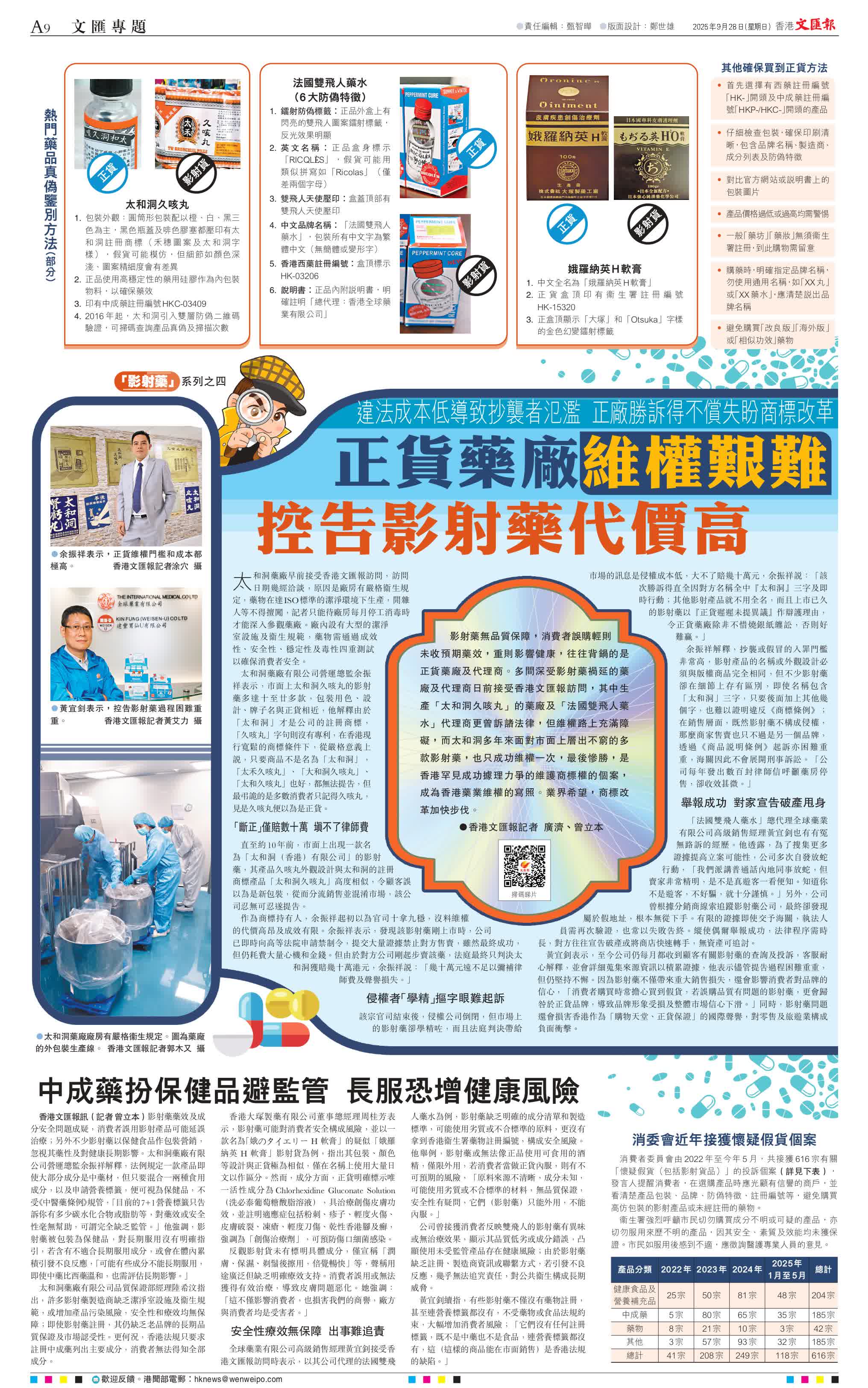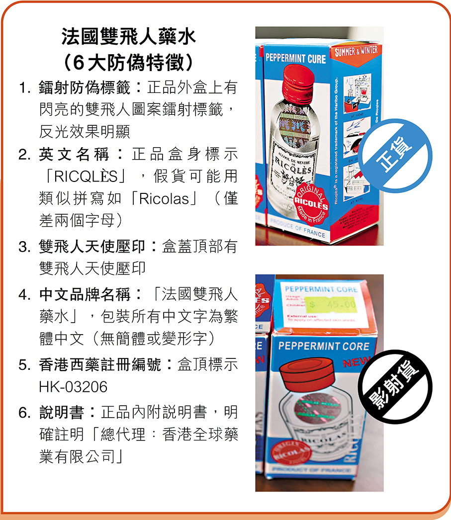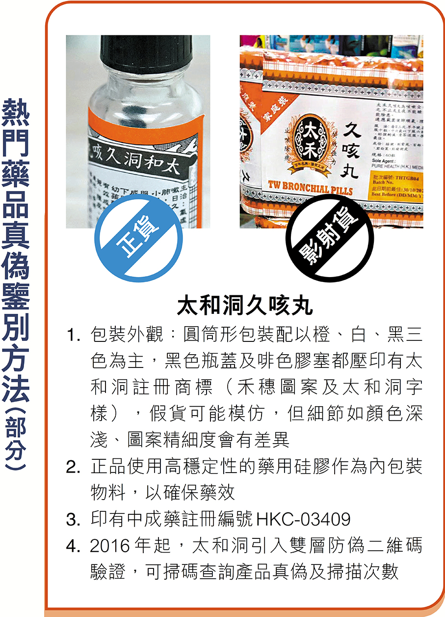 香港文匯報訊(記者 廣濟、曾立本)影射藥無品質保障,消費者誤購輕則未收預期藥效,重則影響健康,往往背鍋的是正貨藥廠及代理商。多間深受影射藥禍延的藥廠及代理商日前接受香港文匯報訪問,其中生產「太和洞久咳丸」的藥廠及「法國雙飛人藥水」代理商更曾訴諸法律,但維權路上充滿障礙,而太和洞多年來面對市面上層出不窮的多款影射藥,也只成功維權一次,最後慘勝,是香港罕見成功據理力爭的維護商標權的個案,成為香港藥業維權的寫照。業界希望,商標改革加快步伐。