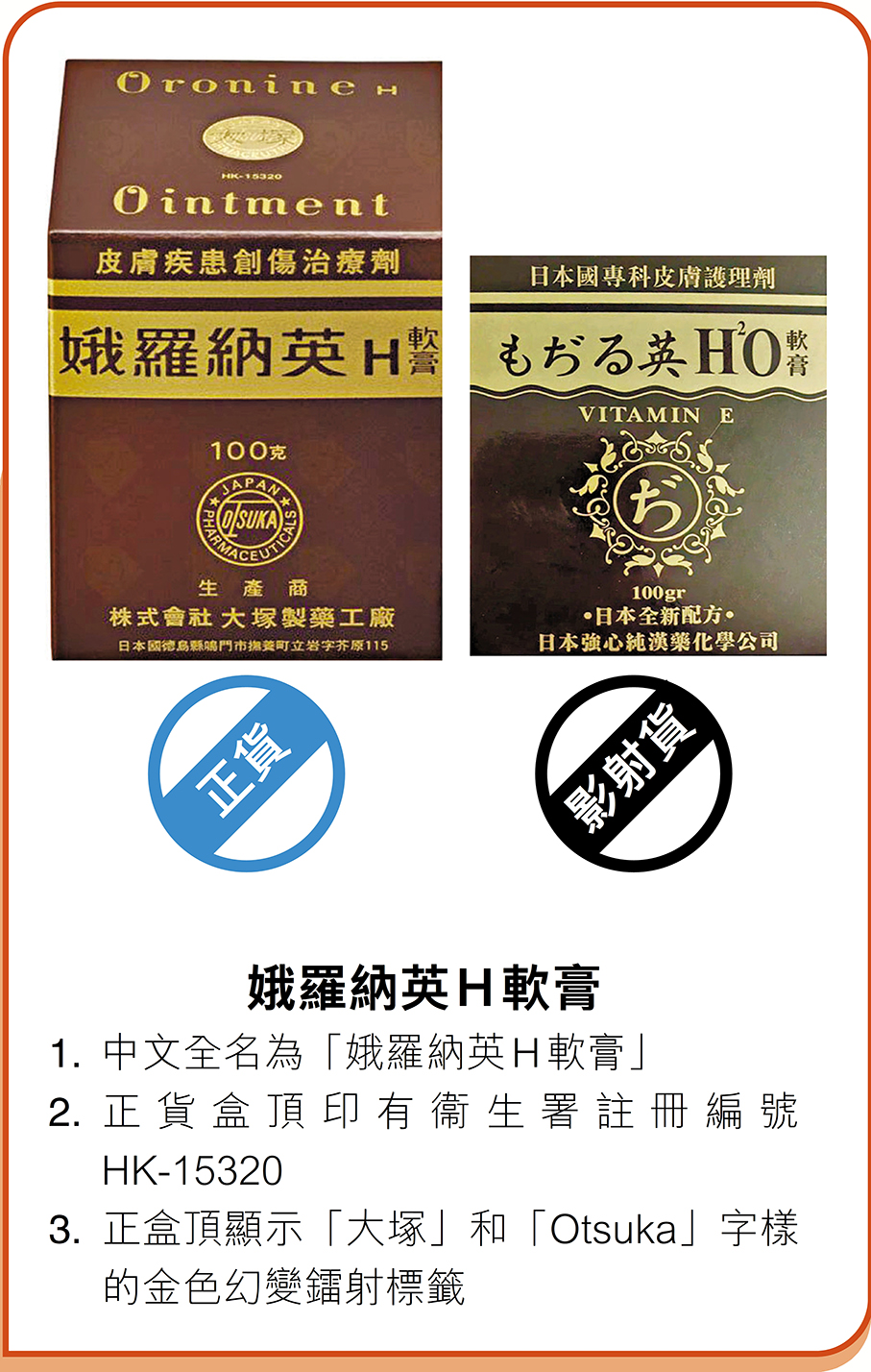 香港大塚製藥有限公司董事總經理周桂芳表示,影射藥可能對消費者安全構成風險,並以一款名為「娥のタイエリー H 軟膏」的疑似「娥羅納英 H 軟膏」影射貨為例,指出其包裝、顏色等設計與正貨極為相似,僅在名稱上使用大量日文以作區分。然而,成分方面,正貨明確標示唯一活性成分為Chlorhexidine Gluconate Solution(洗必泰葡萄糖酸脂溶液),具治療創傷皮膚功效,並註明適應症包括粉刺、疹子、輕度火傷、皮膚破裂、凍瘡、輕度刀傷、乾性香港腳及癬,強調為「創傷治療劑」,可預防傷口細菌感染。