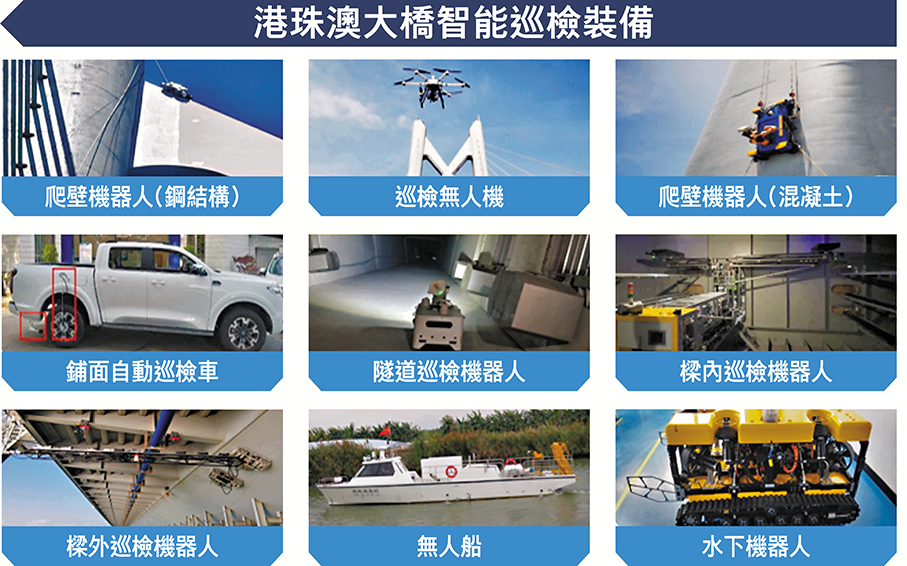 作為入選廣東智慧交通十大典型案例的項目,「港珠澳大橋數字化工程建設與運維應用實踐」項目助力構建了「數字港珠澳大橋」。其中,項目團隊研發了13套基於無人搭載平台的橋島隧智能巡檢技術及裝備,建立海陸空一體化檢測體系。譬如,研製水下檢測無人船、水下機器人、水下檢測數據處理及可視化系統等,突破大橋水下環境感知、多檢測設備集成控制等技術難題。同時,針對大橋高空、臨邊、隱蔽部位巡檢作業需求,團隊首次構建「水上關鍵設施無人檢測平台集群」,包括箱樑內外、沉管隧道行車道等各類巡檢機器人。