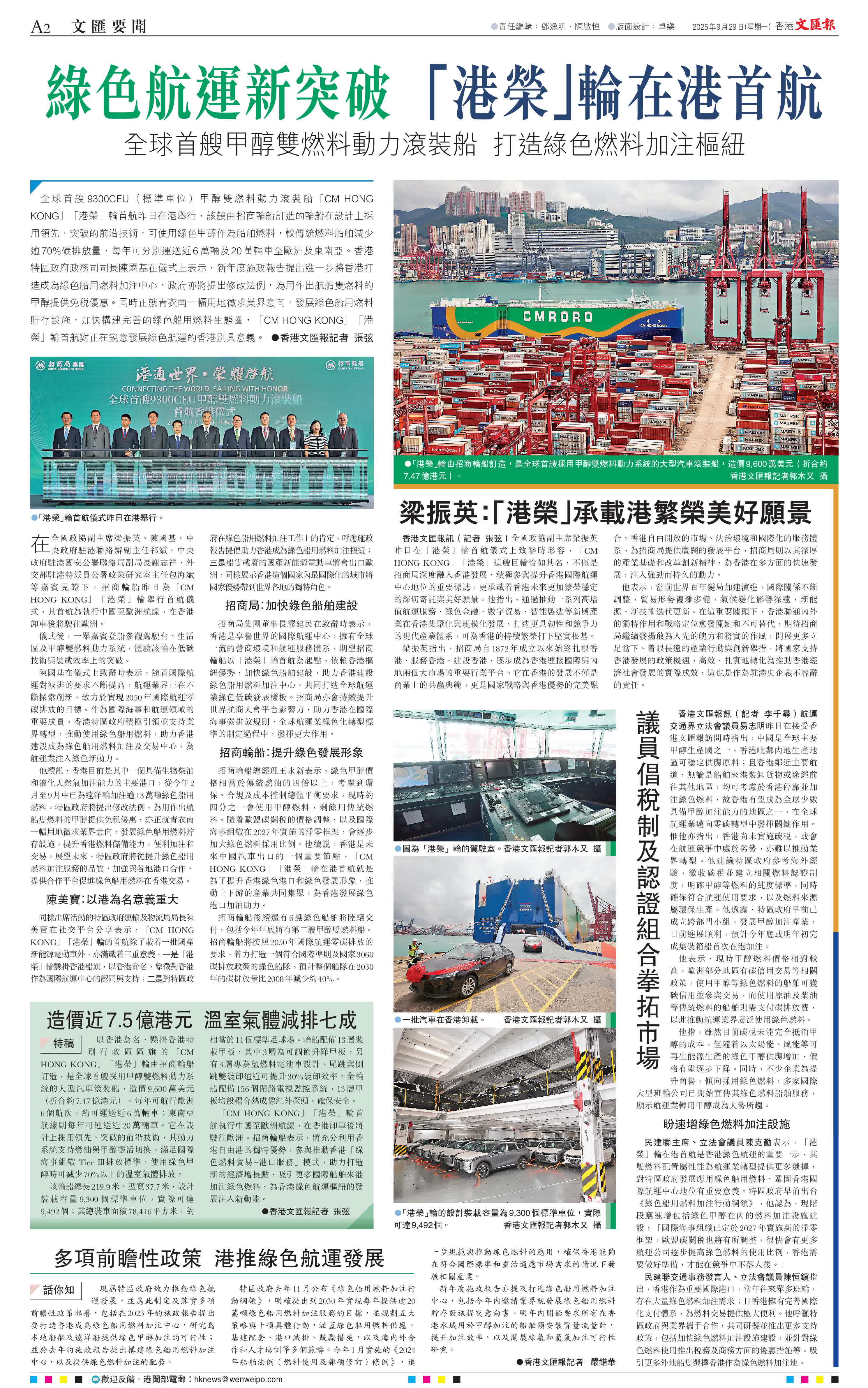 (香港文匯報記者 張弦)全球首艘9300CEU(標準車位)甲醇雙燃料動力滾裝船「CM HONG KONG」「港榮」輪首航昨日在港舉行,該艘由招商輪船訂造的輪船在設計上採用領先、突破的前沿技術,可使用綠色甲醇作為船舶燃料,較傳統燃料船舶減少逾70%碳排放量,每年可分別運送近6萬輛及20萬輛車至歐洲及東南亞。香港特區政府政務司司長陳國基在儀式上表示,新年度施政報告提出進一步將香港打造成為綠色船用燃料加注中心,政府亦將提出修改法例,為用作出航船隻燃料的甲醇提供免稅優惠。同時正就青衣南一幅用地徵求業界意向,發展綠色船用燃料貯存設施,加快構建完善的綠色船用燃料生態圈,「CM HONG KONG」「港榮」輪首航對正在銳意發展綠色航運的香港別具意義。
