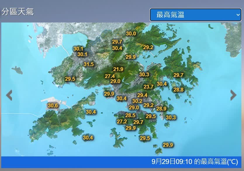 天氣酷熱,本港今早9時許,多處已錄得逾30度,打鼓嶺30.0度、元朗公園31.5度、沙田30.3度、深水埗30.4度、九龍城30.2度。