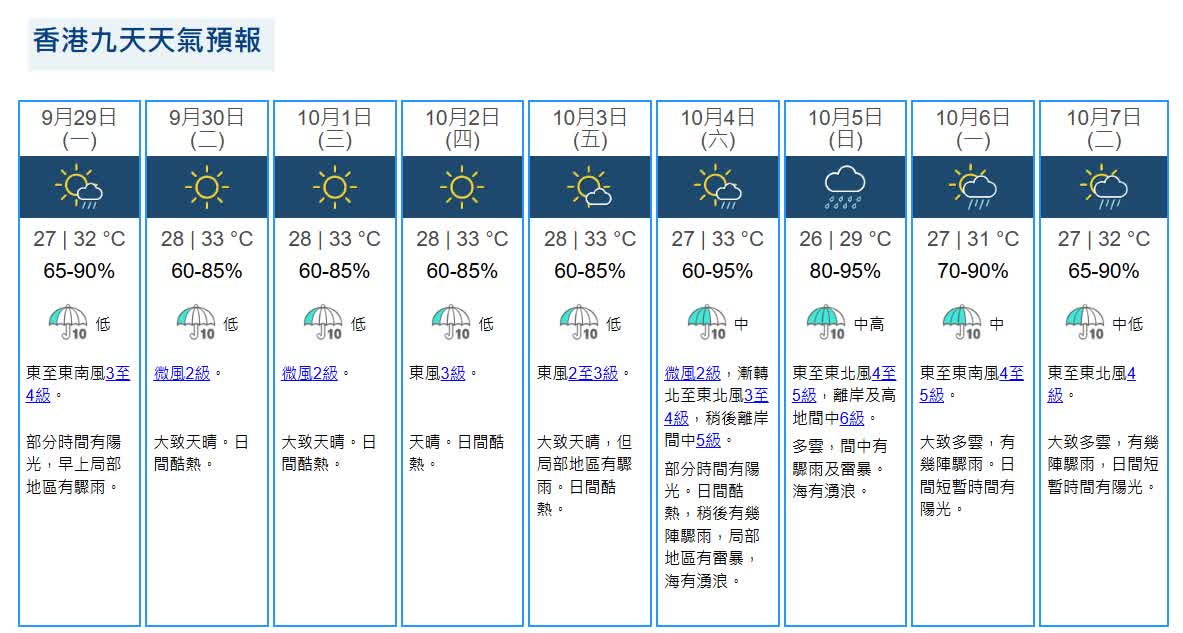 展望本港未來兩三日大致天晴及酷熱。星期二(30日)天氣大致天晴,日間酷熱,氣溫介乎28至33度。星期三(10月1日)天氣大致天晴,日間酷熱,氣溫介乎28至33度。