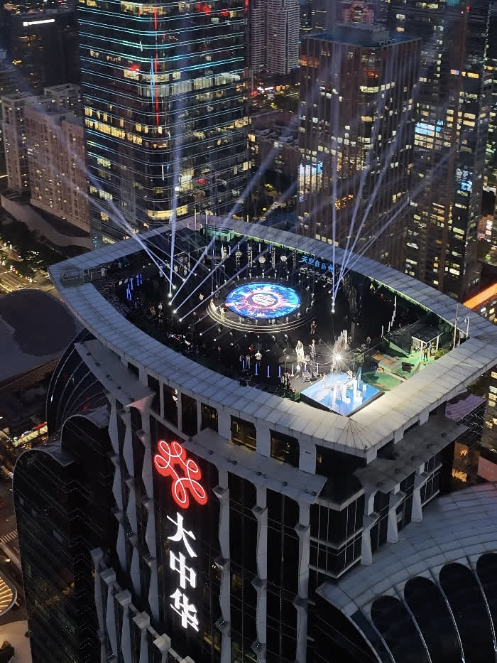 此次天空音樂會,進一步延展物理空間,創新採用「舞台演繹+線下觀演+跨屏播出」多維形式,徹底打破傳統演出空間邊界。舞台設於城市中軸線核心區大中華國際交易廣場樓頂停機坪,以高200多米、面積近2000平方米的「天空舞台」為基礎,配以360°環繞地屏與270°環幕樓體燈光秀,營造出「頭頂星河璀璨,身後灣區繁華,腳下城市流光」的三維立體場景,極大提升了戶外演出的視覺衝擊力。