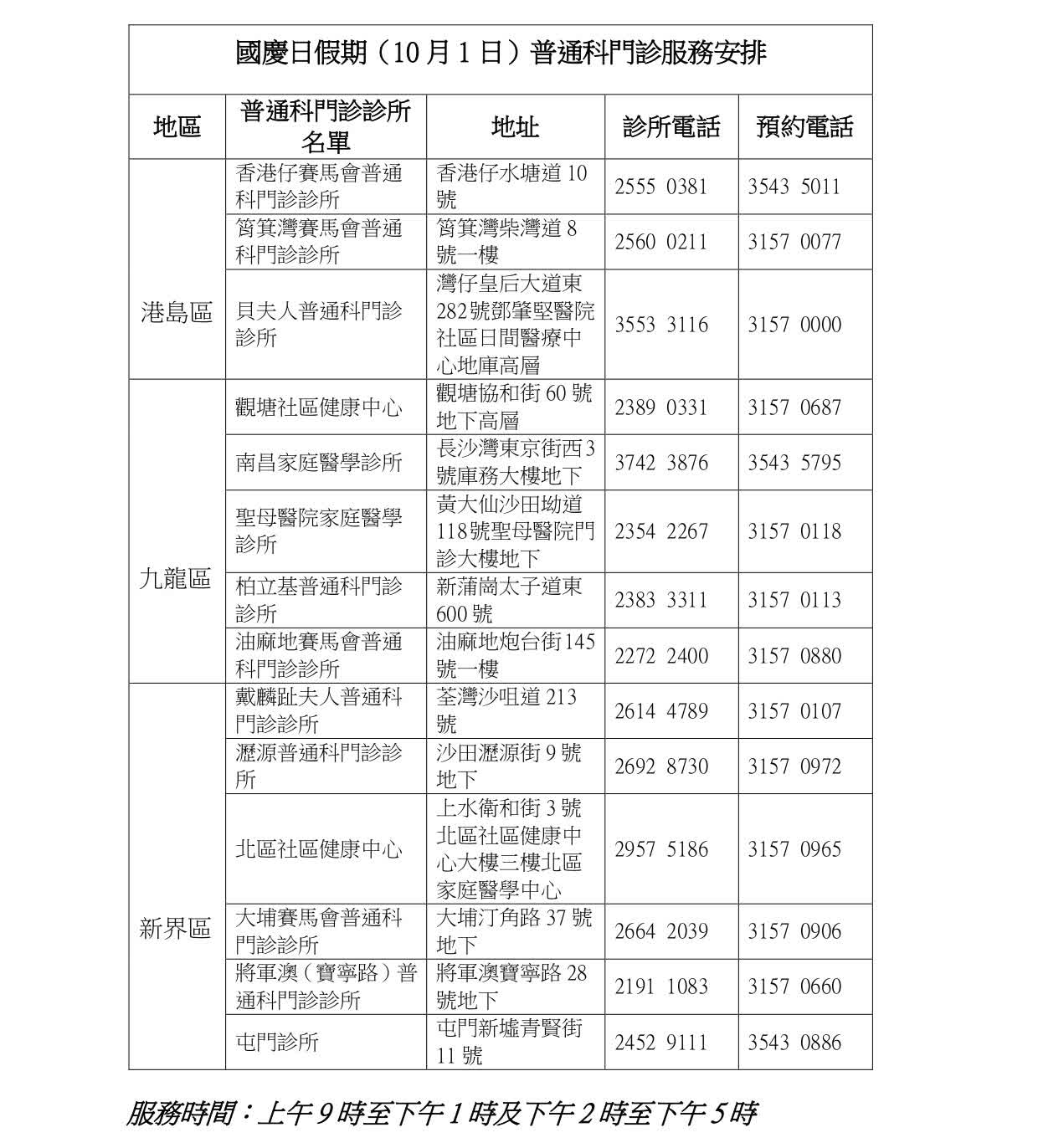 香港文匯報訊 醫管局今日(29日)公布,九龍西醫院聯網轄下的南昌家庭醫學診所將會加強服務,由10月開始新增星期日及公眾假期普通科門診服務,方便市民在假期期間求診。連同南昌家庭醫學診所,國慶日公眾假期(10月1日)將有15間普通科門診診所(詳見下表)提供公眾假期普通科門診服務。