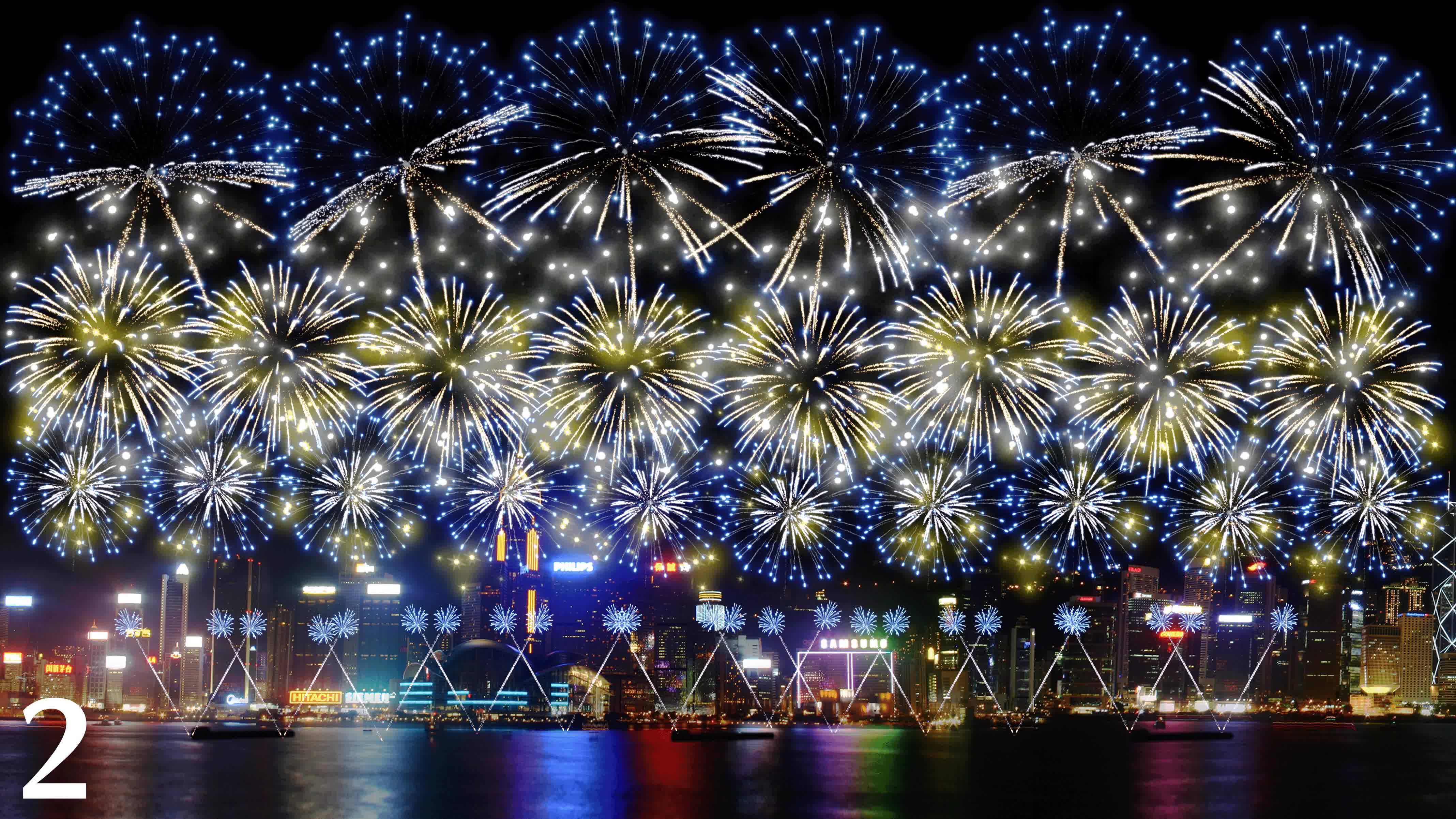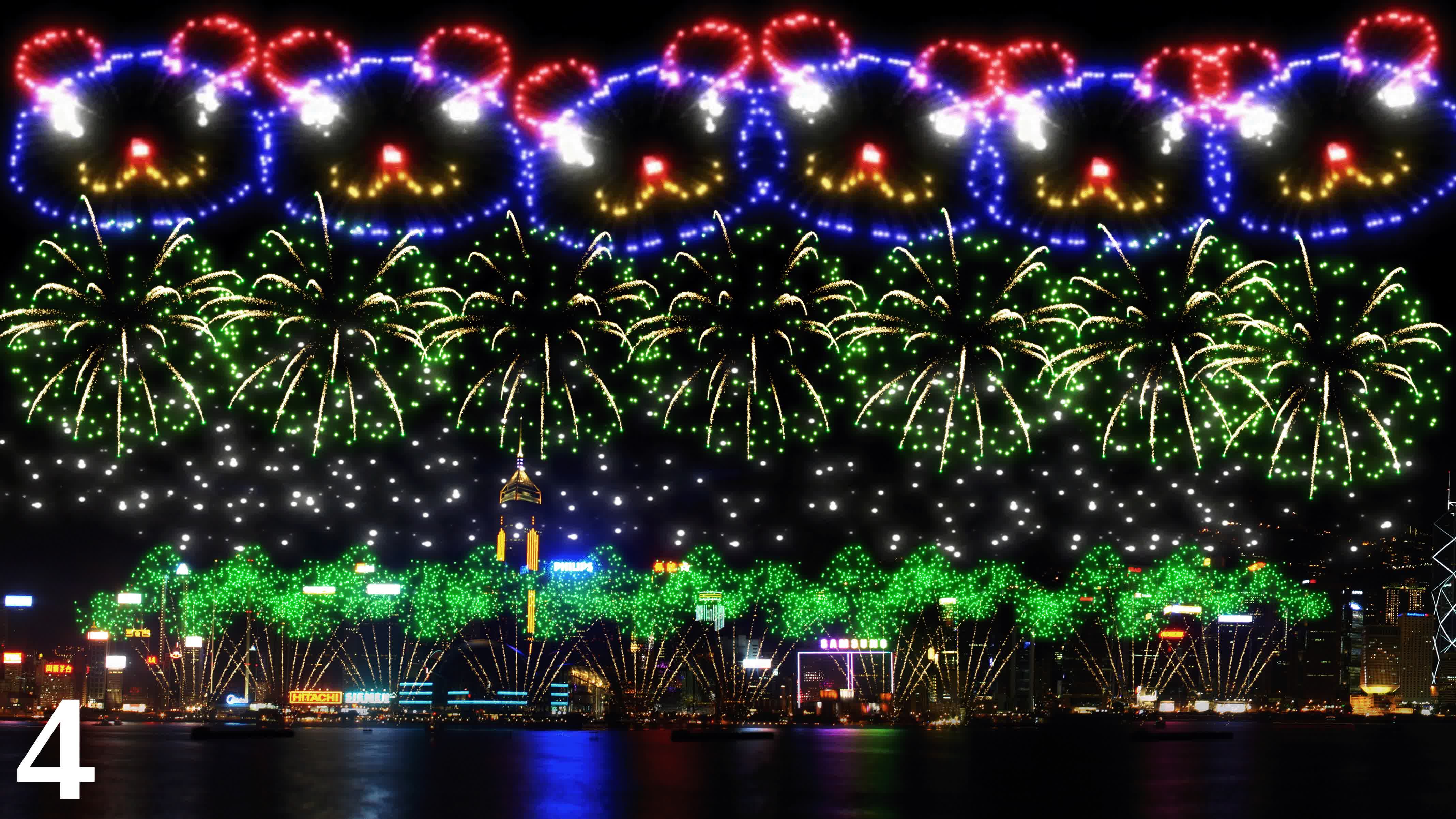 煙花匯演首先以「煙花綻放賀國慶」揭開序幕,呈現牡丹、金菊及銀閃圓球,伴隨澎湃音樂,展現中華民族的奮鬥精神與復興力量。第四幕「總是可愛大熊貓」將綻放出多個大熊貓頭像圖案,同時搭配比喻竹林的綠色禮花彈,帶出熊貓經濟的構思,為香港帶來希望。
