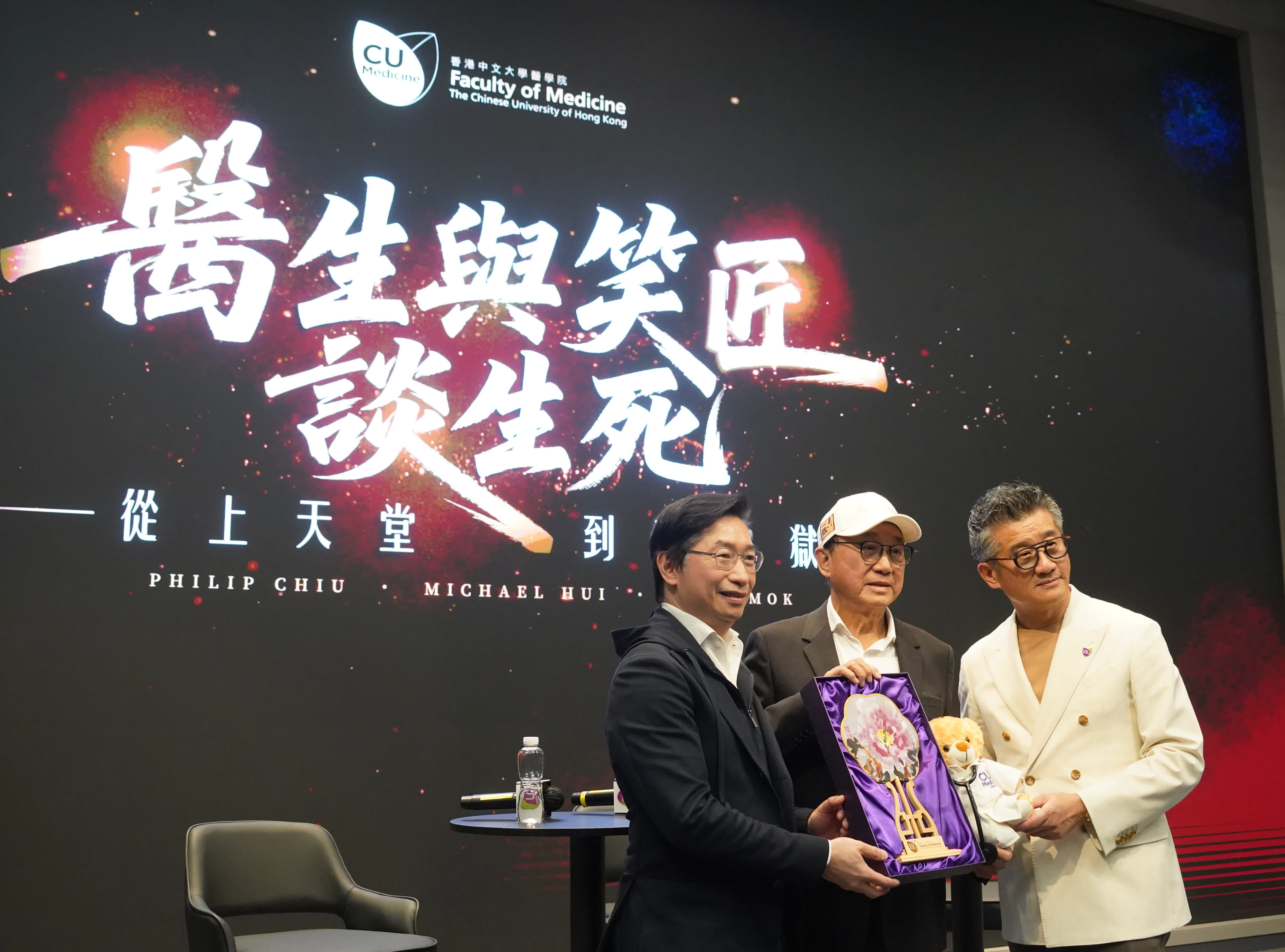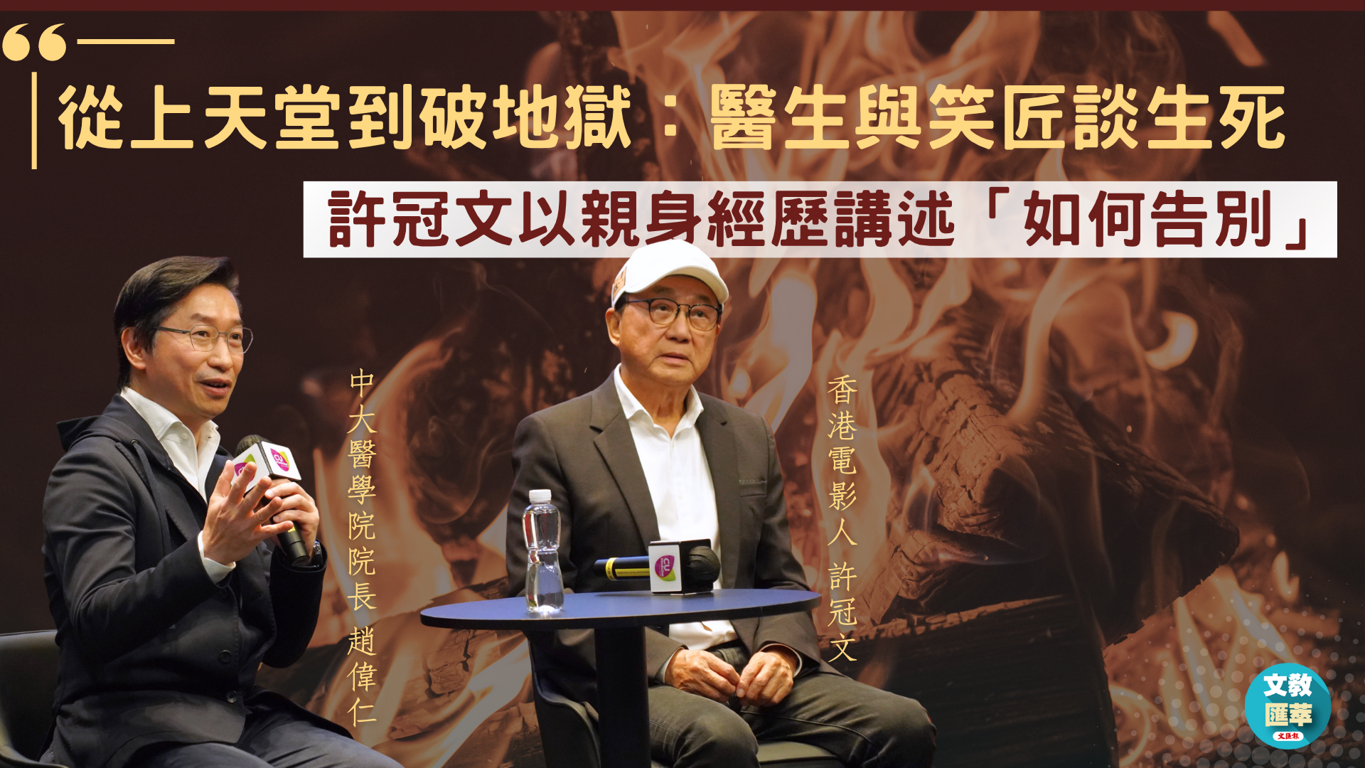 在華人社會,死亡是忌諱;不過,在醫學與教育領域中,「生與死」卻是非常重要的課題,醫護人員在提供治療或處理病人事務時,很多時要直面生與死相關的抉擇,惟年輕一輩的醫科生卻未必有太多機會親身面對生死重要關口。香港中文大學醫學院昨日舉辦「從上天堂到破地獄:醫生與笑匠談生死」對談會,數百人的講廳座無虛席,一眾未來醫學界希望對談中窺探到更多生死間的智慧。講台上,一位是用喜劇呈現人生的香港電影人許冠文,一位是身經無數臨床考驗的中大醫學院院長趙偉仁,加上擔任主持的腫瘤學系系主任莫樹錦,他們共同穿越科學與信仰、理性與情感的邊界,談人與死亡的相遇、距離與準備。