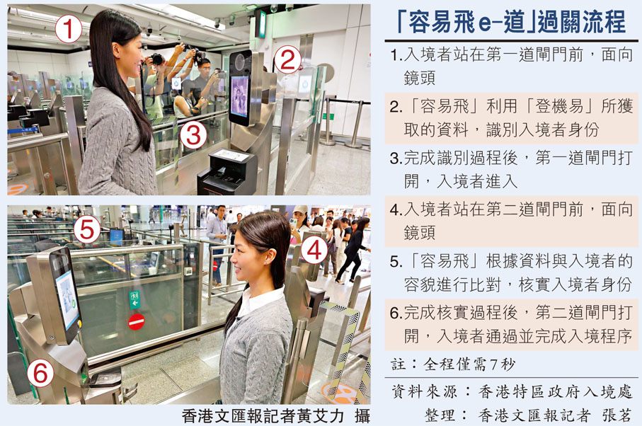 為方便香港居民入境香港,香港特區政府入境處由今日(30日)起推出「容易飛e-道」服務,年滿11歲的合資格香港居民透過機場入境時,只需在通道鏡頭前展示容貌核實身份即可完成入境手續,過程中無須出示任何證件或「非觸式e-道」的加密二維碼,且無須事先登記。入境處助理處長(資訊系統)柯重鈺昨日表示,使用「容易飛e-道」入境全程僅需7秒,較傳統「e-道」快一秒且額外省卻從行李或背包中掏出證件的時間,料新服務會受市民歡迎,預計每年有800萬人次使用。機場現有26條入境「e-道」,其中10條今日率先成為「容易飛e-道」,餘下則於明年初起陸續升級;預計2027年底前機場合共52條入境「e-道」會提供「容易飛」服務,待技術突破後會陸續擴展至其他口岸。●香港文匯報記者 張茗