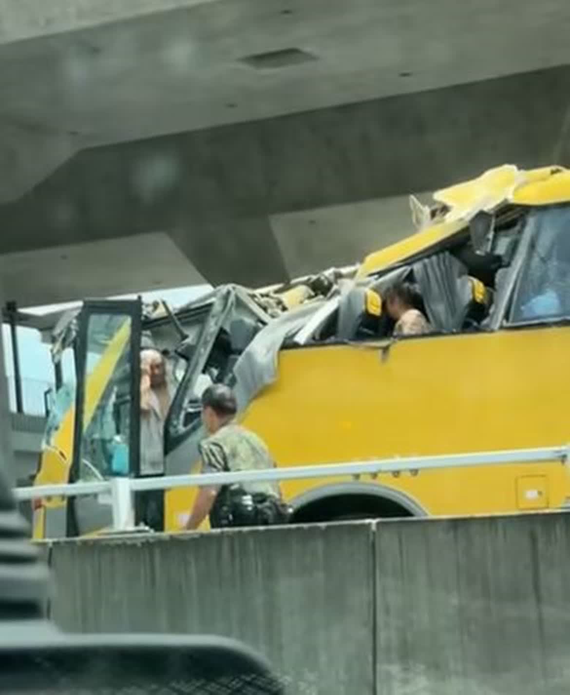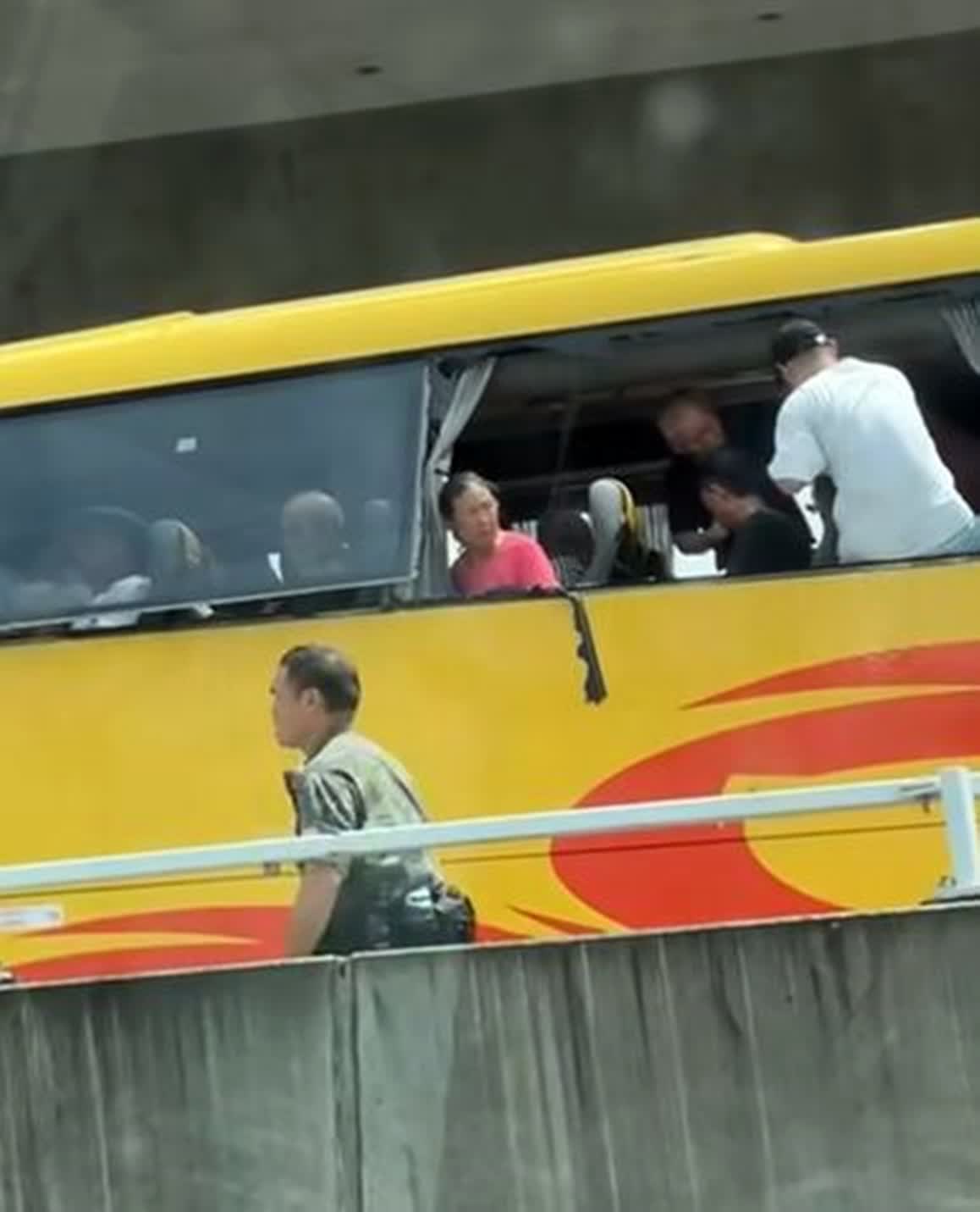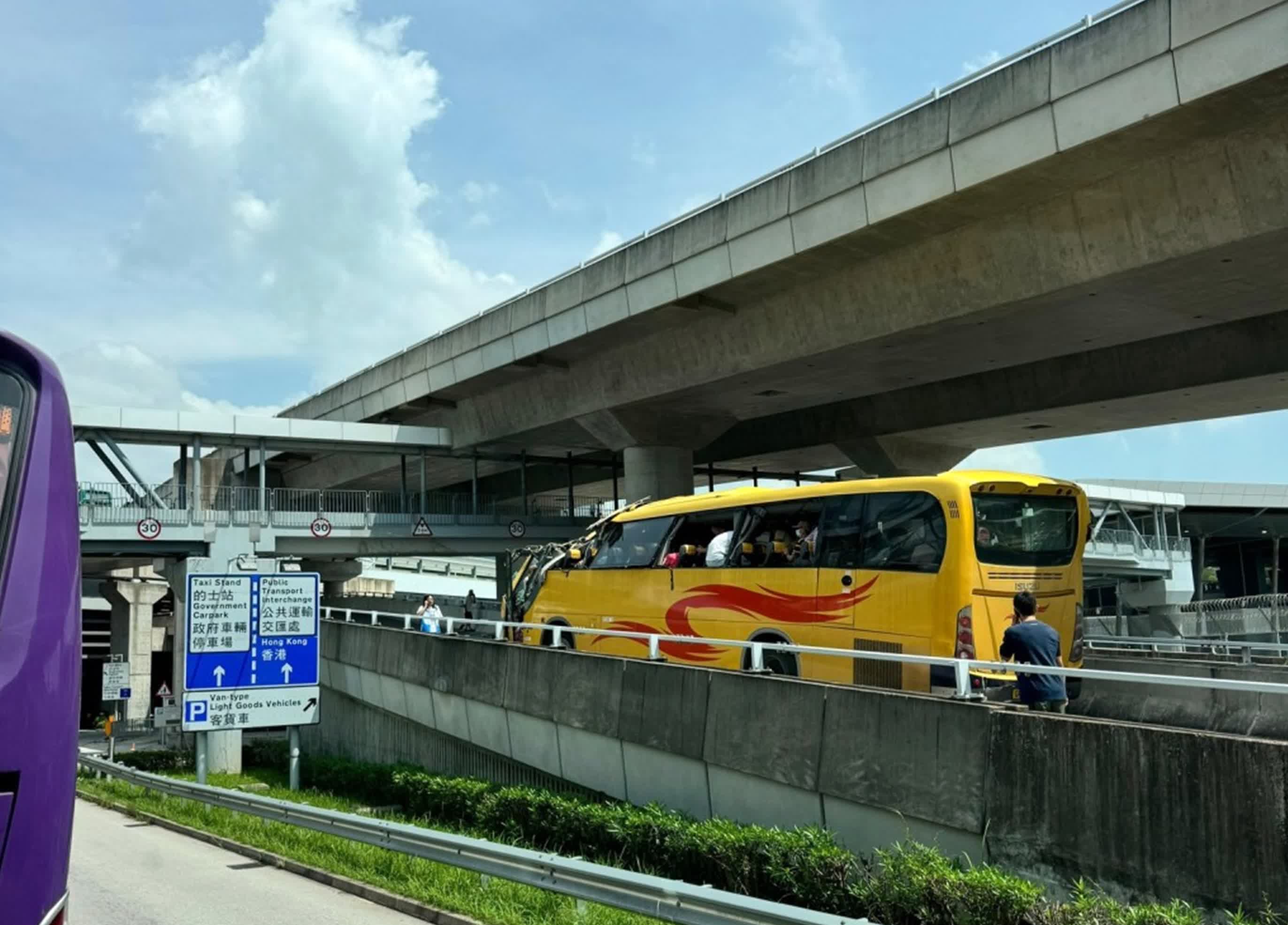 事發今日中午12時許,一輛載有45名乘客的旅遊巴,沿打鼓嶺蓮麻坑路往香園圍管制站方向行駛,疑「行錯路」駛入管制站M座停車場入口的一段上斜橋面,因上址限制高度超過2.4米的車輛駛入,旅遊巴車身高度超限,車頭撞及行人天橋底,頂部被削開嚴重損毀,最少15名乘客受輕傷,其中2男12女(38歲至85歲)需要送院治理。