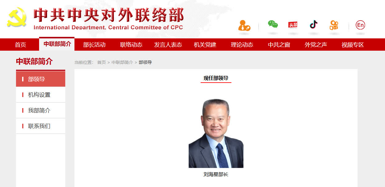 中共中央對外聯絡部網站「部領導」一欄最新信息顯示,劉海星已任中共中央對外聯絡部部長。