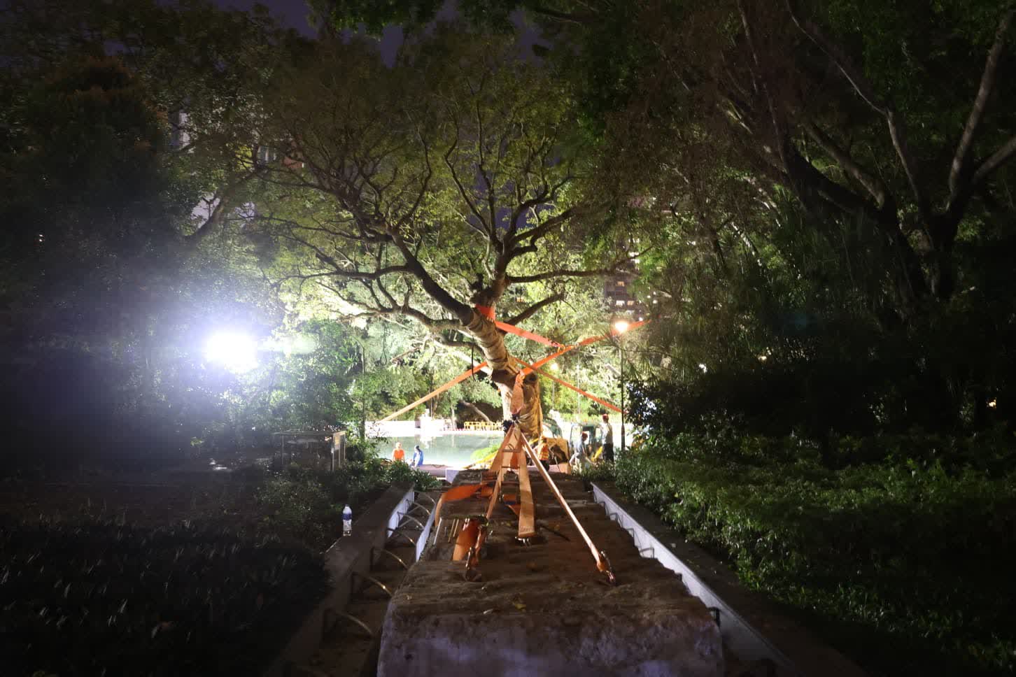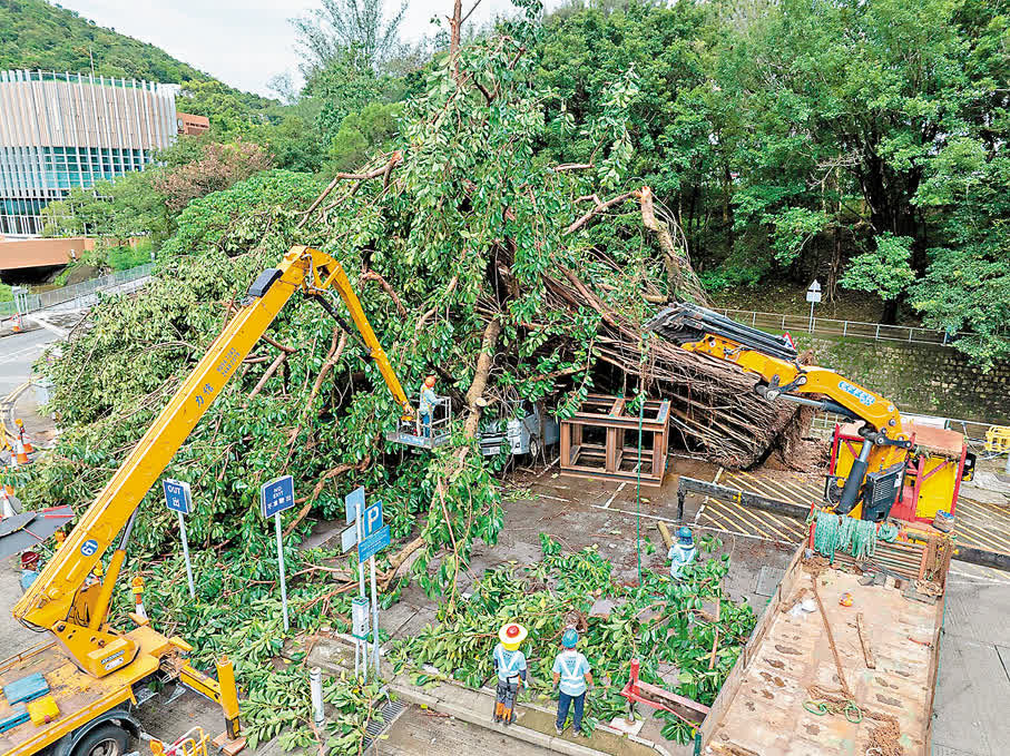 香港文匯報訊(記者 蕭景源)超強颱風樺加沙早前襲港期間,尖沙咀九龍公園一棵樹齡逾110年的大葉合歡樹倒塌,中國建築社區應急義工隊受委託協助搶救古樹,今日(9月30日)出動起重設備,嘗試把古樹扶正,這棵高約15米的茂盛古樹,由於80%根莖已斷裂脫土,且樹身有空心化跡象;加上作業空間狹窄,義工隊出動重型設施吊運時困難重重,經過義工們的不懈努力,至晚上終於把大樹扶正,交給康文署護養。