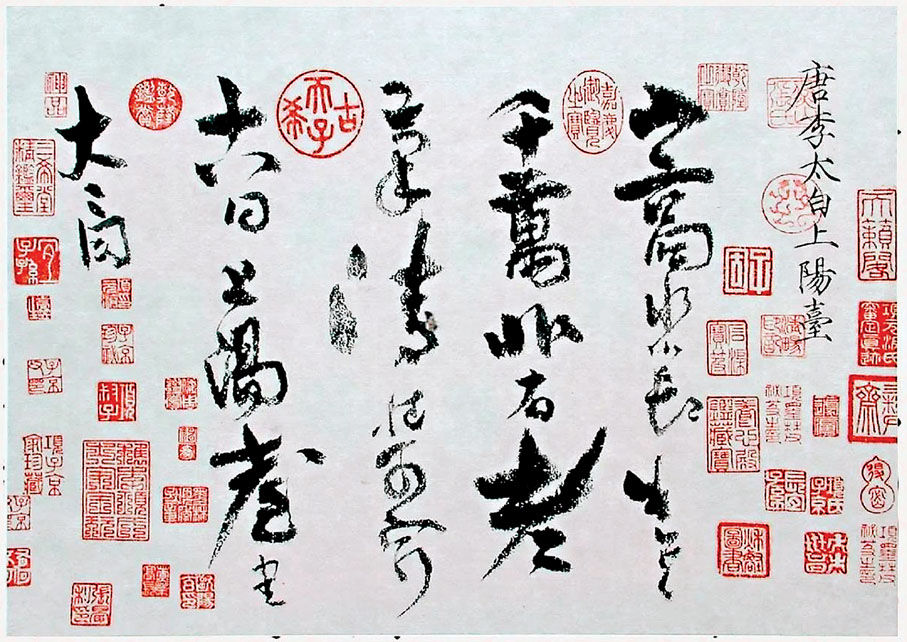 李白草書《上陽臺》,「山高水長,物象千萬,非有老筆,清壯可窮。十八日上陽臺書。太白。」這短短25個字,既是對書法作品的註解,也充滿了李白一貫的豪邁詩風與人生哲思。其書蒼勁雄偉中見姿媚挺秀,其筆勢忽疾忽徐,似有千言萬語奔湧而來。中鋒走筆時的沉穩,是胸有丘壑的篤定;側鋒掃過的飛白,是驟然湧上心頭的波瀾。墨色濃處,如重錘叩擊心扉,是「會當凌絕頂」的豪情;淡墨輕寫處,似輕嘆拂過耳畔,是「月是故鄉明」的柔思。那看似隨意的牽絲,原是情感的藤蔓,將字與字、心與心悄然相連。