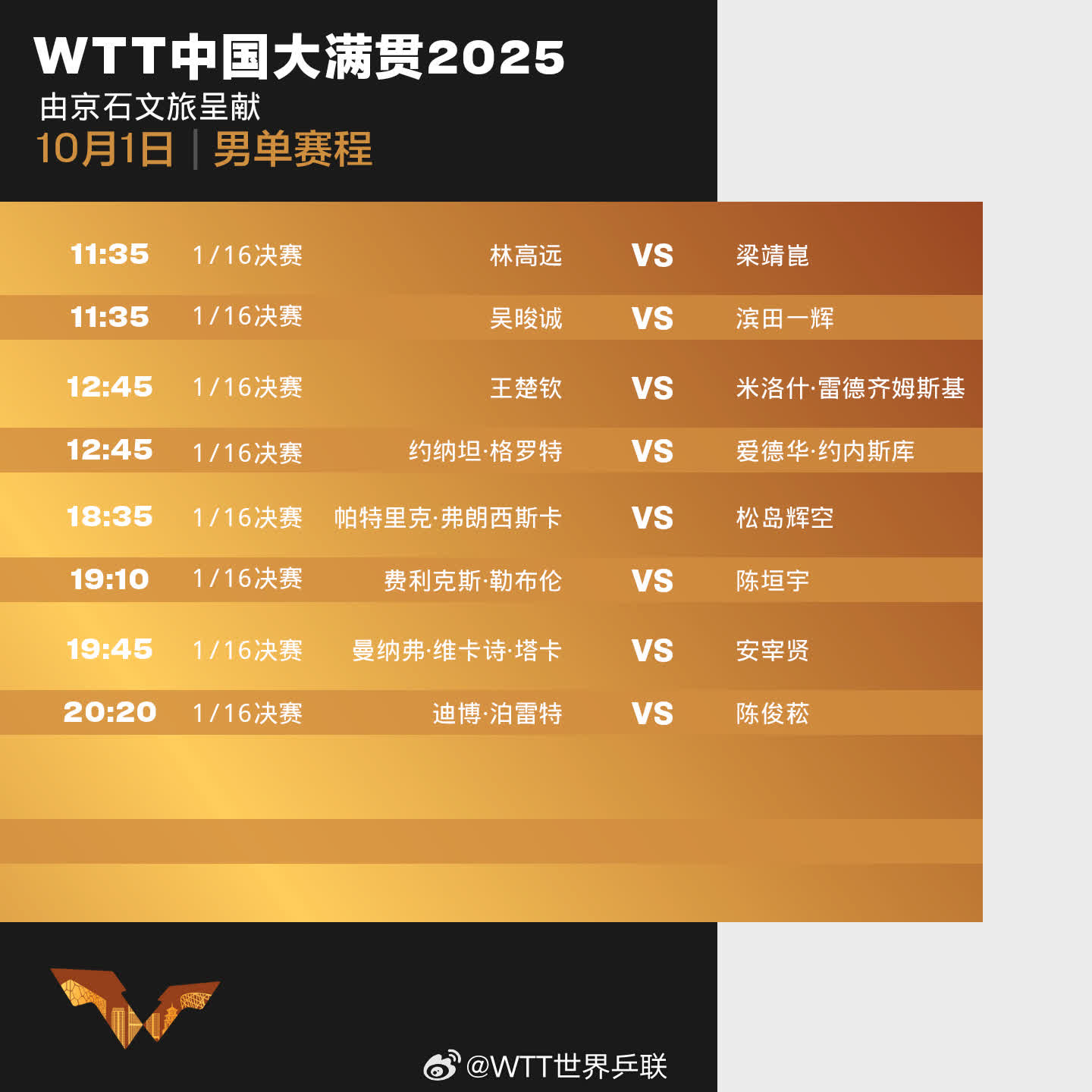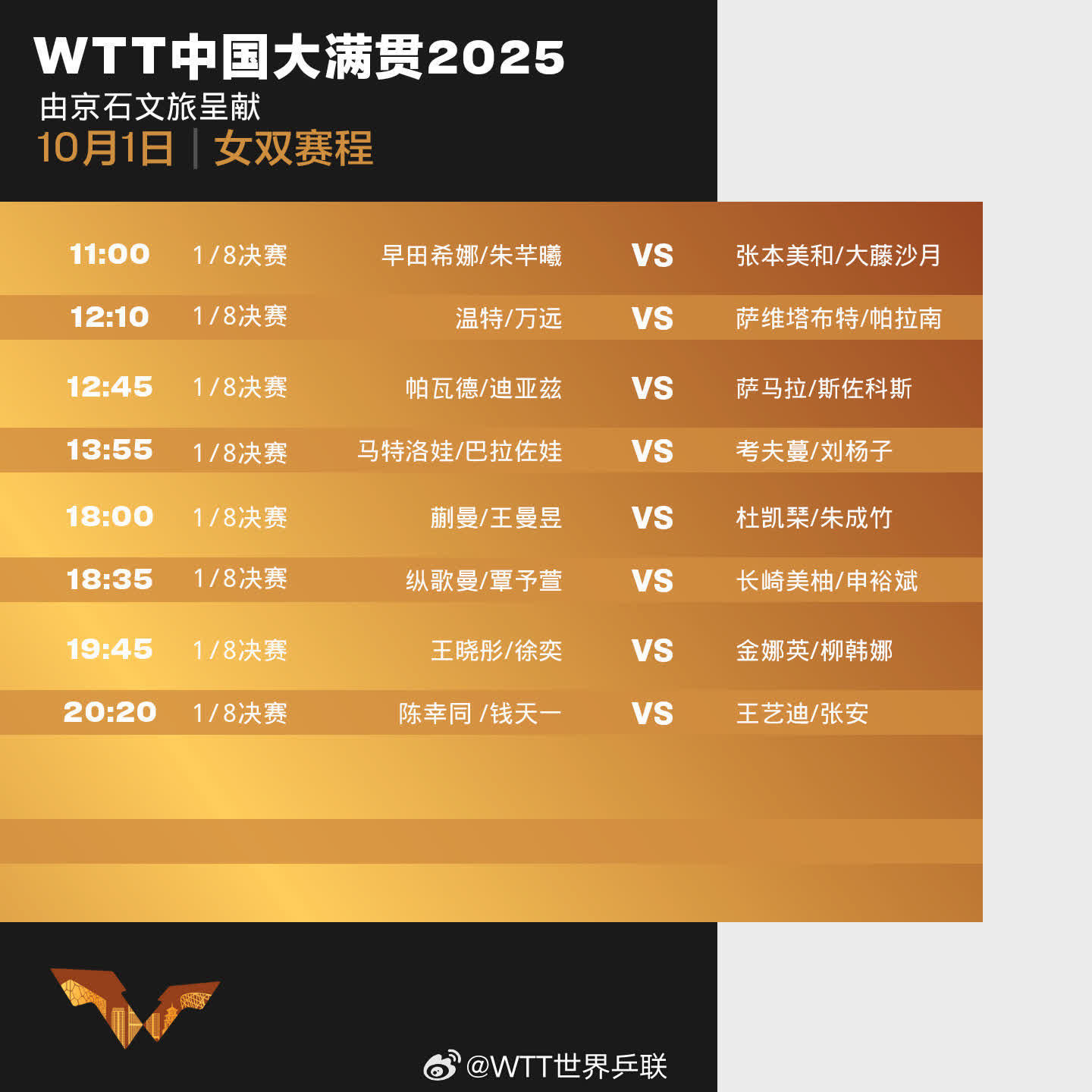 WTT中國大滿貫2025精彩對決將繼續上演,10月1日20:55混雙1/4決賽,王楚欽/孫穎莎組合將迎戰隊友陳垣宇/蒯曼組合。具體賽程如下: