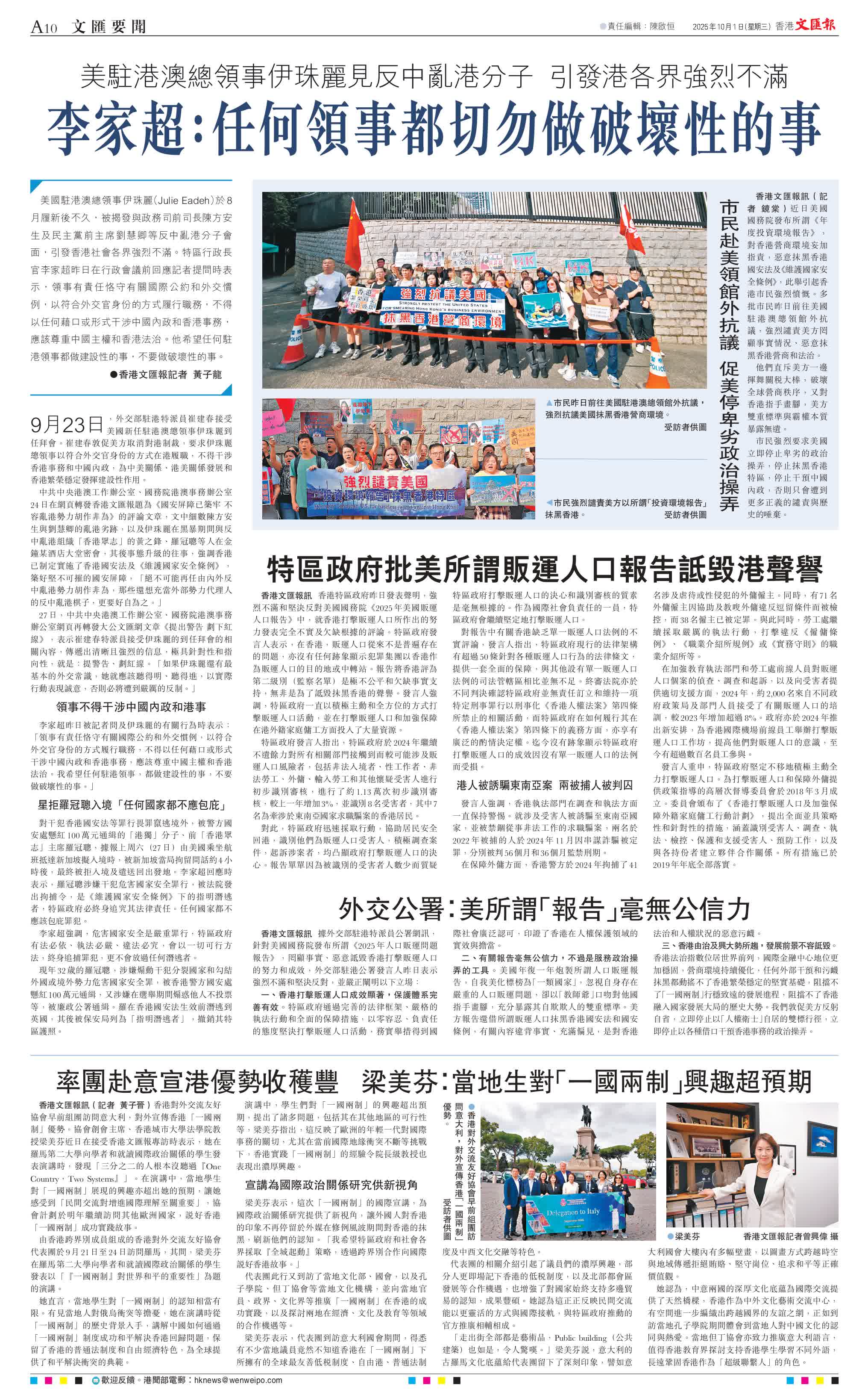 香港文匯報訊(記者 黃子龍)美國駐港澳總領事伊珠麗(Julie Eadeh)於8月履新後不久,被揭發與政務司前司長陳方安生及民主黨前主席劉慧卿等反中亂港分子會面,引發香港社會各界強烈不滿。特區行政長官李家超昨日在行政會議前回應記者提問時表示,領事有責任恪守有關國際公約和外交慣例,以符合外交官身份的方式履行職務,不得以任何藉口或形式干涉中國內政和香港事務,應該尊重中國主權和香港法治。他希望任何駐港領事都做建設性的事,不要做破壞性的事。