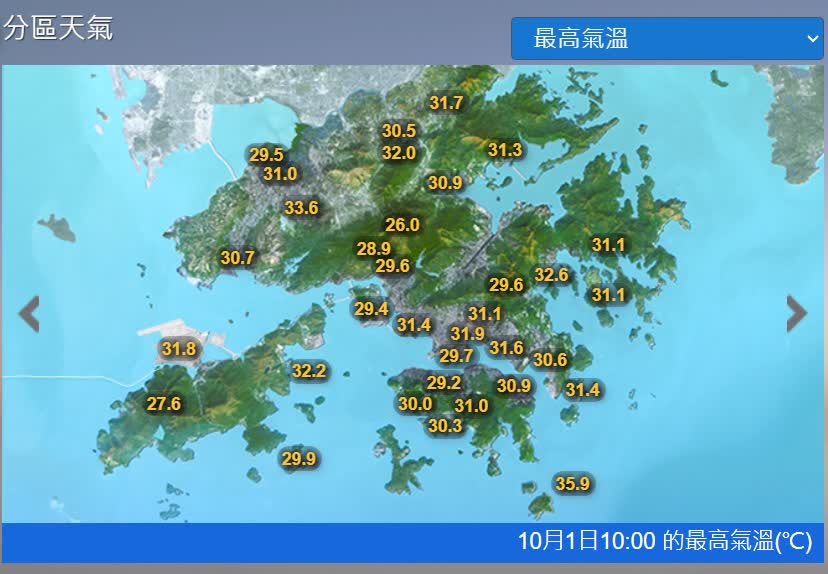 本港今早10時,多處已錄得逾31.0度氣溫,元朗公園33.6度、西貢32.6度、打鼓嶺31.7度、大美督31.3度、九龍城31.9度、黃大仙31.1度、跑馬地31.0度、觀塘31.6度。