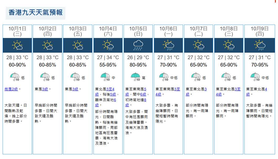 展望本港未來一兩日大致天晴及持續酷熱。星期六稍後至星期日驟雨逐漸增多,風勢頗大,海有大浪及湧浪。中秋節及翌日天色逐步好轉,大致天晴,日間酷熱及乾燥,上部分時間多雲。