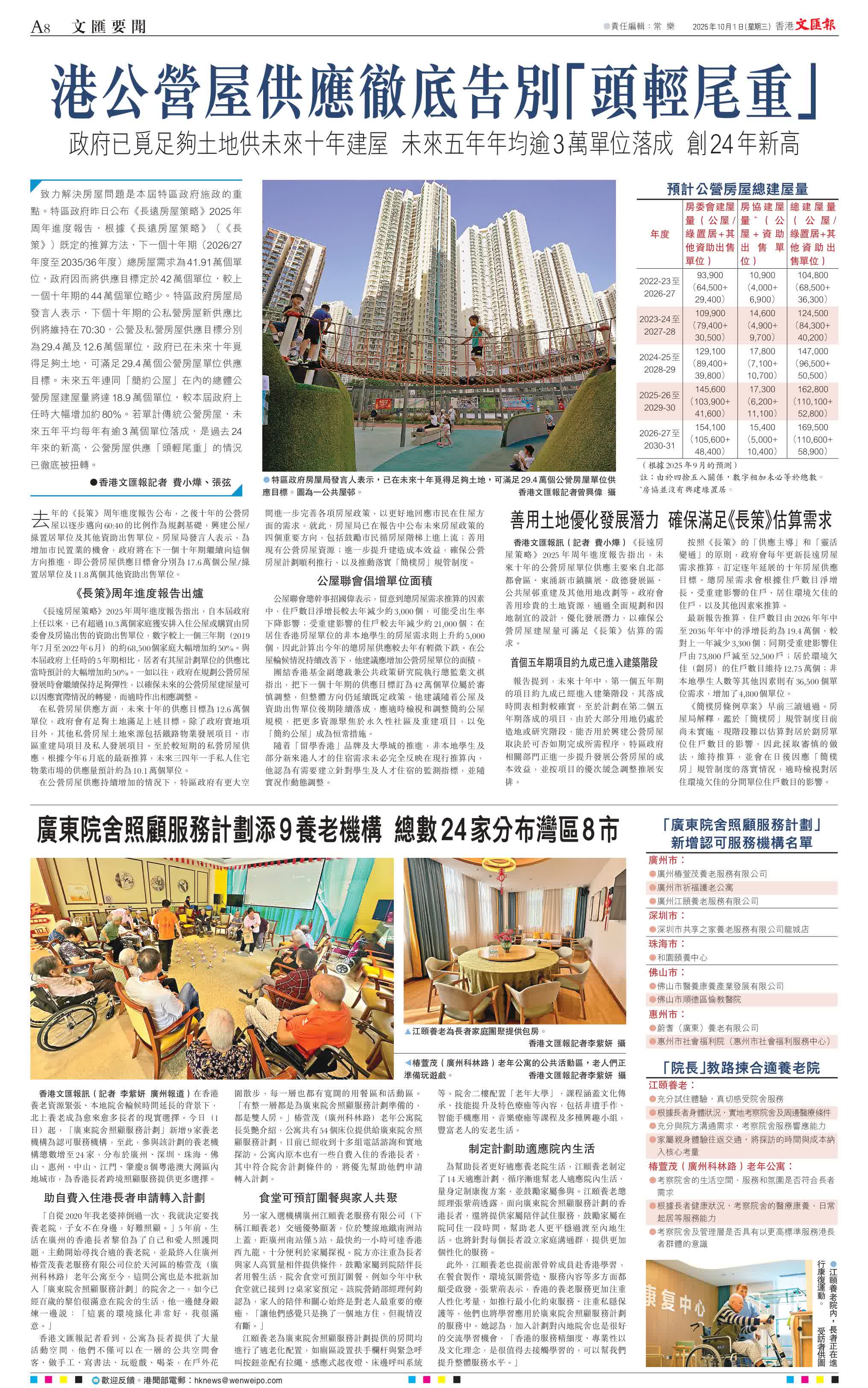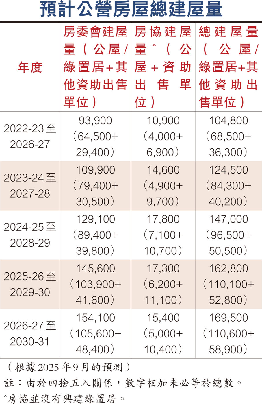 香港文匯報訊(記者 費小燁、張弦)致力解決房屋問題是本屆特區政府施政的重點。特區政府昨日公布《長遠房屋策略》2025年周年進度報告,根據《長遠房屋策略》(《長策》)既定的推算方法,下一個十年期(2026/27年度至2035/36年度)總房屋需求為41.91萬個單位,政府因而將供應目標定於42萬個單位,較上一個十年期的44萬個單位略少。特區政府房屋局發言人表示,下個十年期的公私營房屋新供應比例將維持在70:30,公營及私營房屋供應目標分別為29.4萬及12.6萬個單位,政府已在未來十年覓得足夠土地,可滿足29.4萬個公營房屋單位供應目標。未來五年連同「簡約公屋」在內的總體公營房屋建屋量將達18.9萬個單位,較本屆政府上任時大幅增加約80%。若單計傳統公營房屋,未來五年平均每年有逾3萬個單位落成,是過去24年來的新高,公營房屋供應「頭輕尾重」的情況已徹底被扭轉。