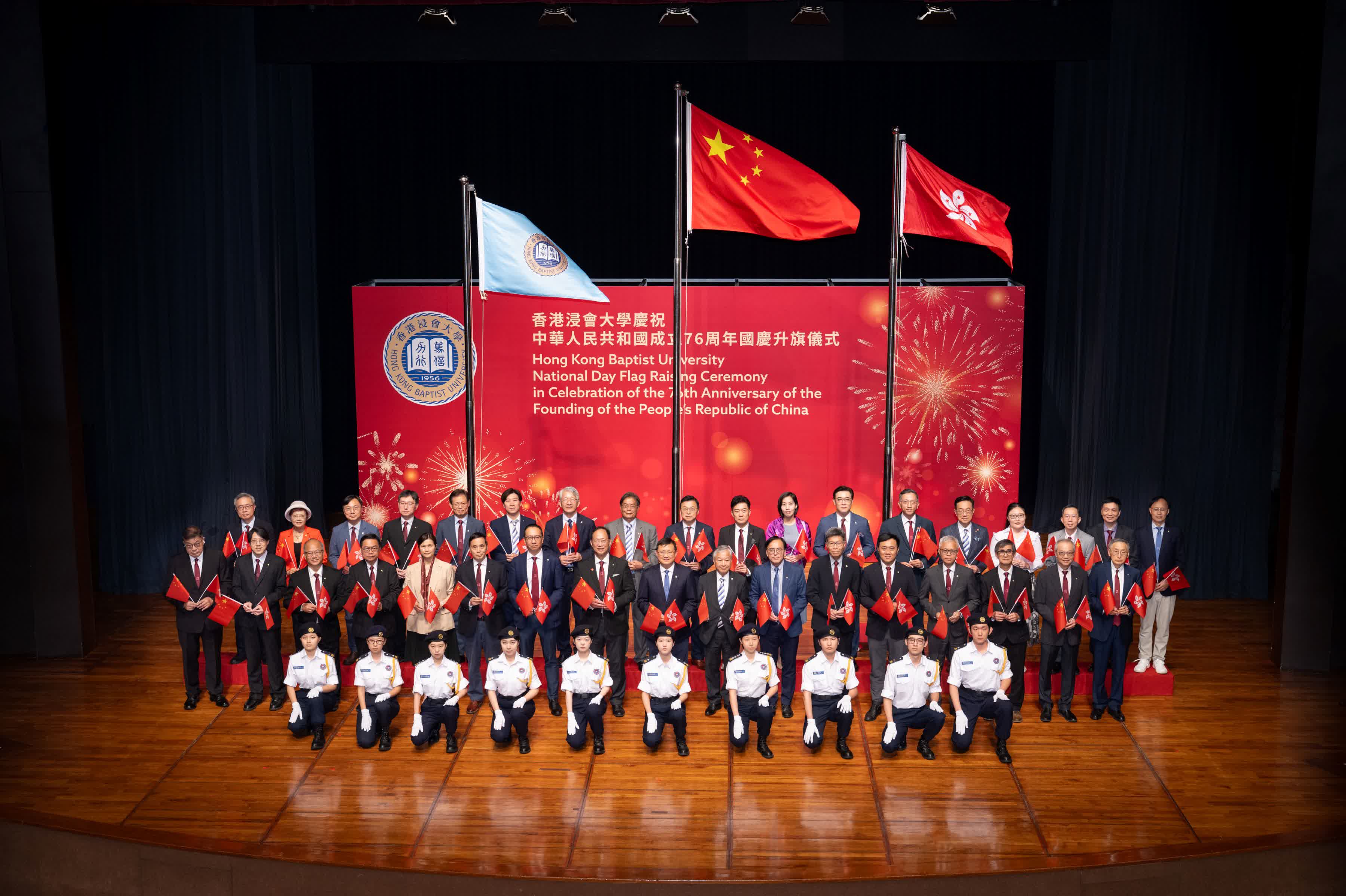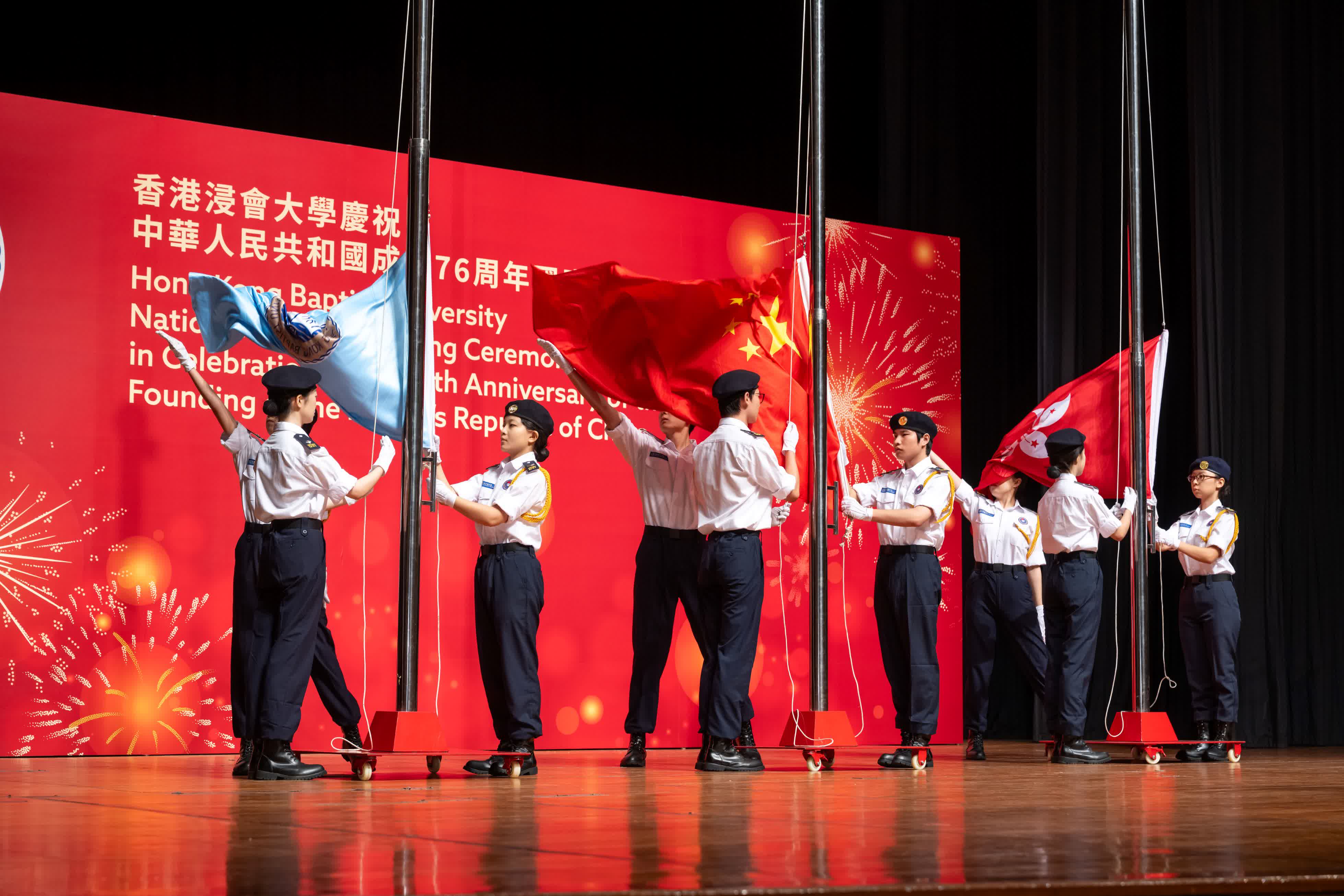 香港浸會大學於今日上午,在校園舉行升旗儀式,慶祝中華人民共和國成立76周年。浸大校董會和諮議會成員、大學主管人員、教職員、校友,以及學生共約300人出席儀式。浸大學生升旗隊在儀式上升掛中華人民共和國國旗、香港特別行政區區旗,以及浸大校旗,共同祝賀祖國數十年來取得的偉大成就,分享國家繁榮富強的喜悅與自豪。