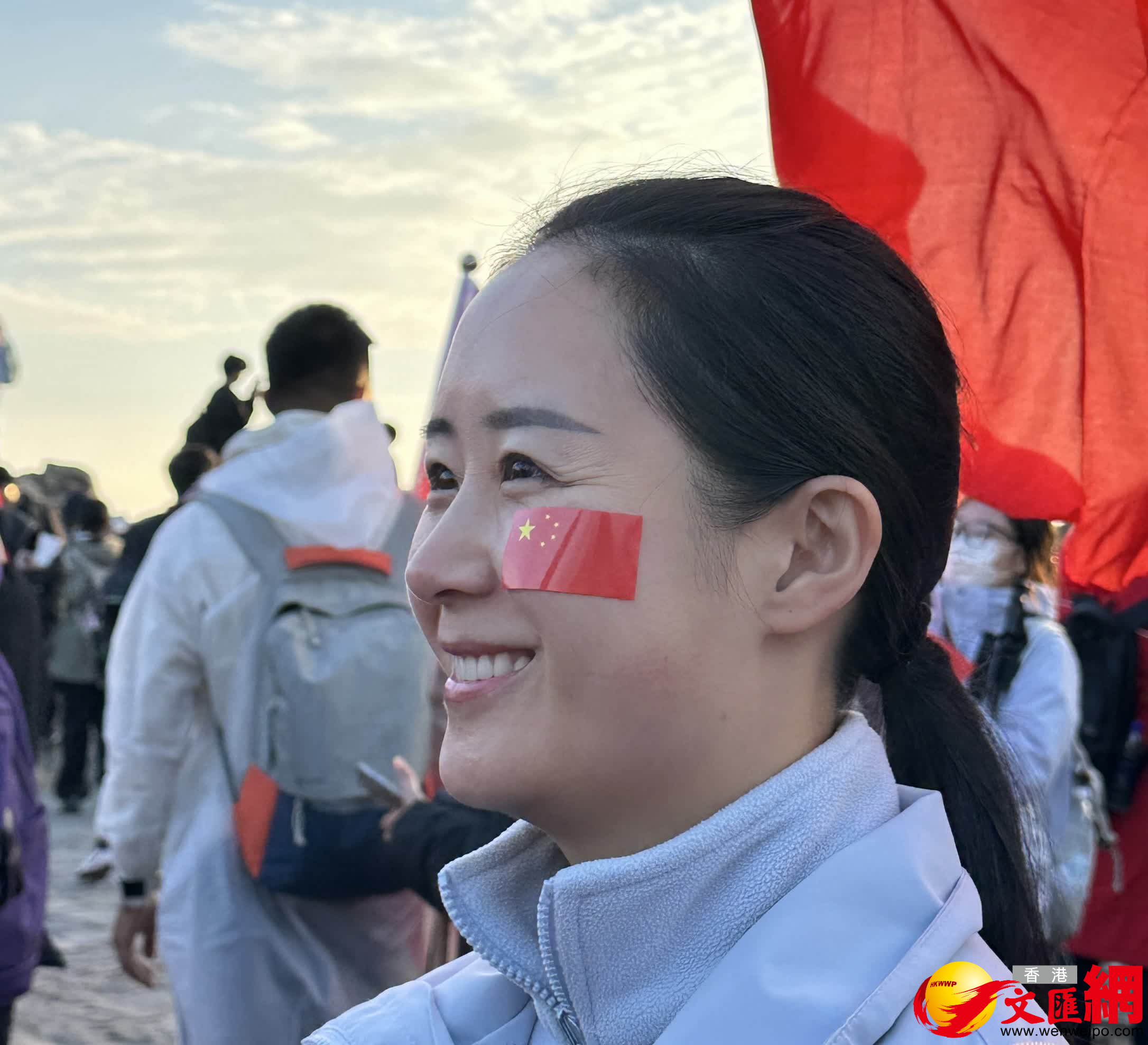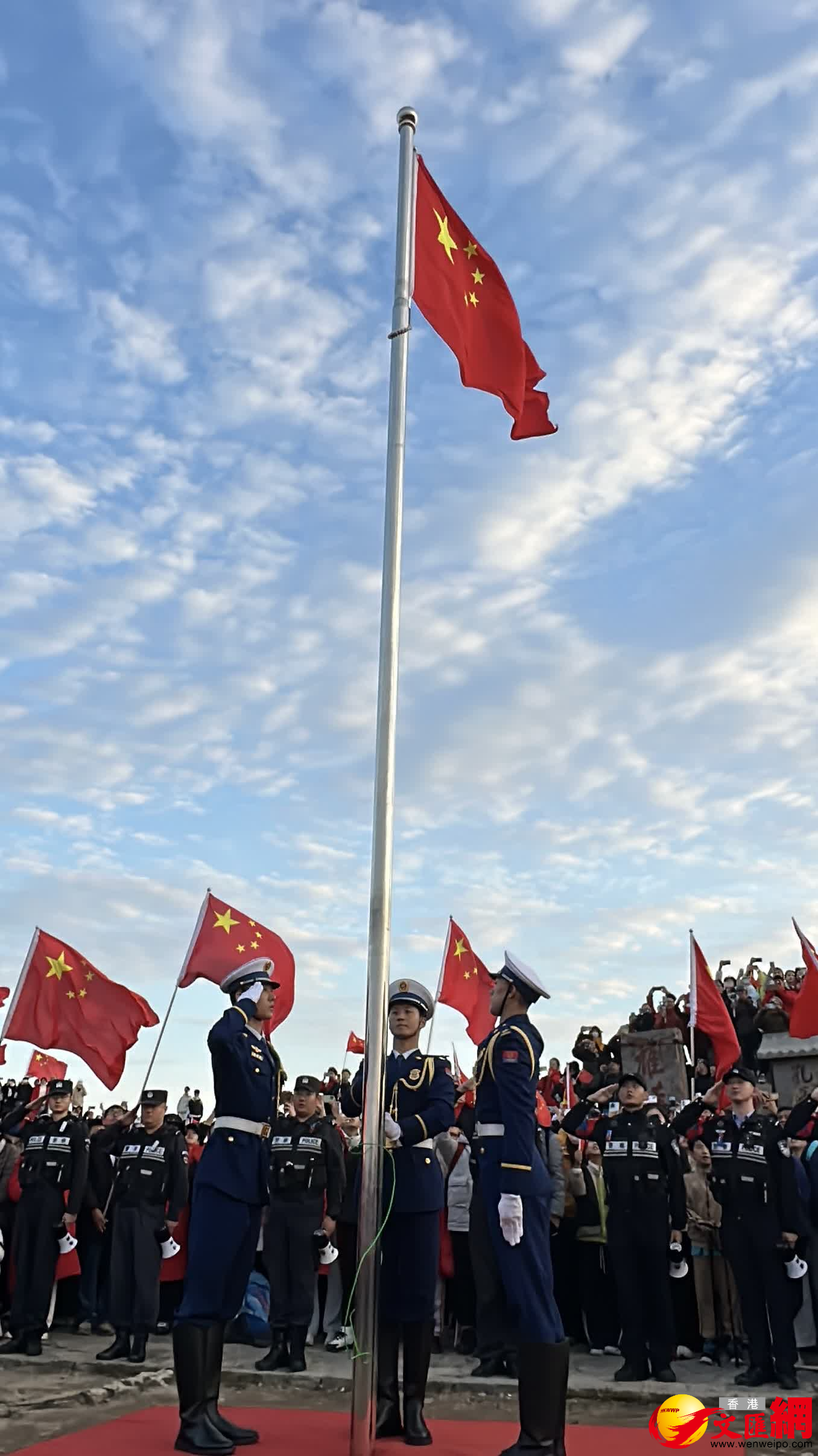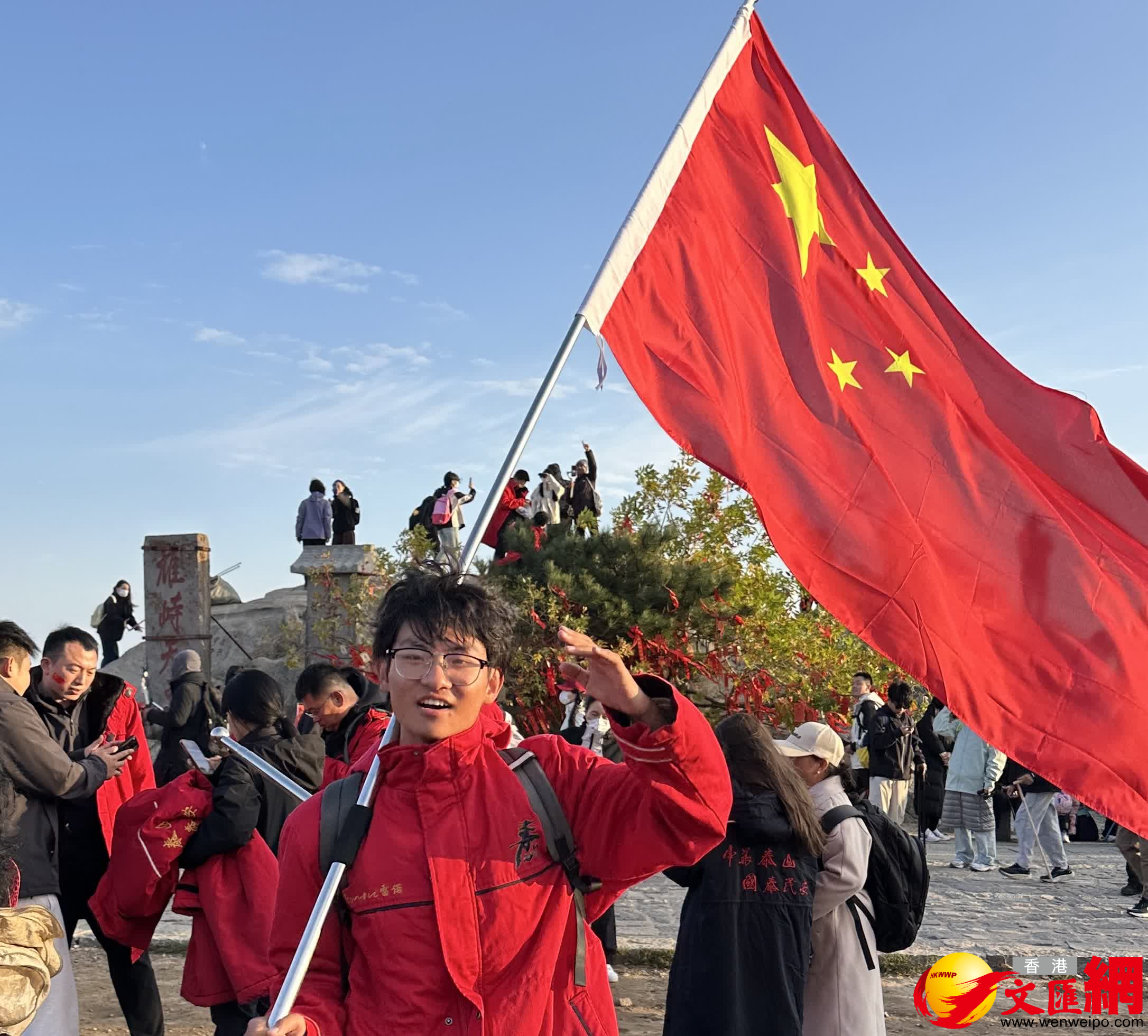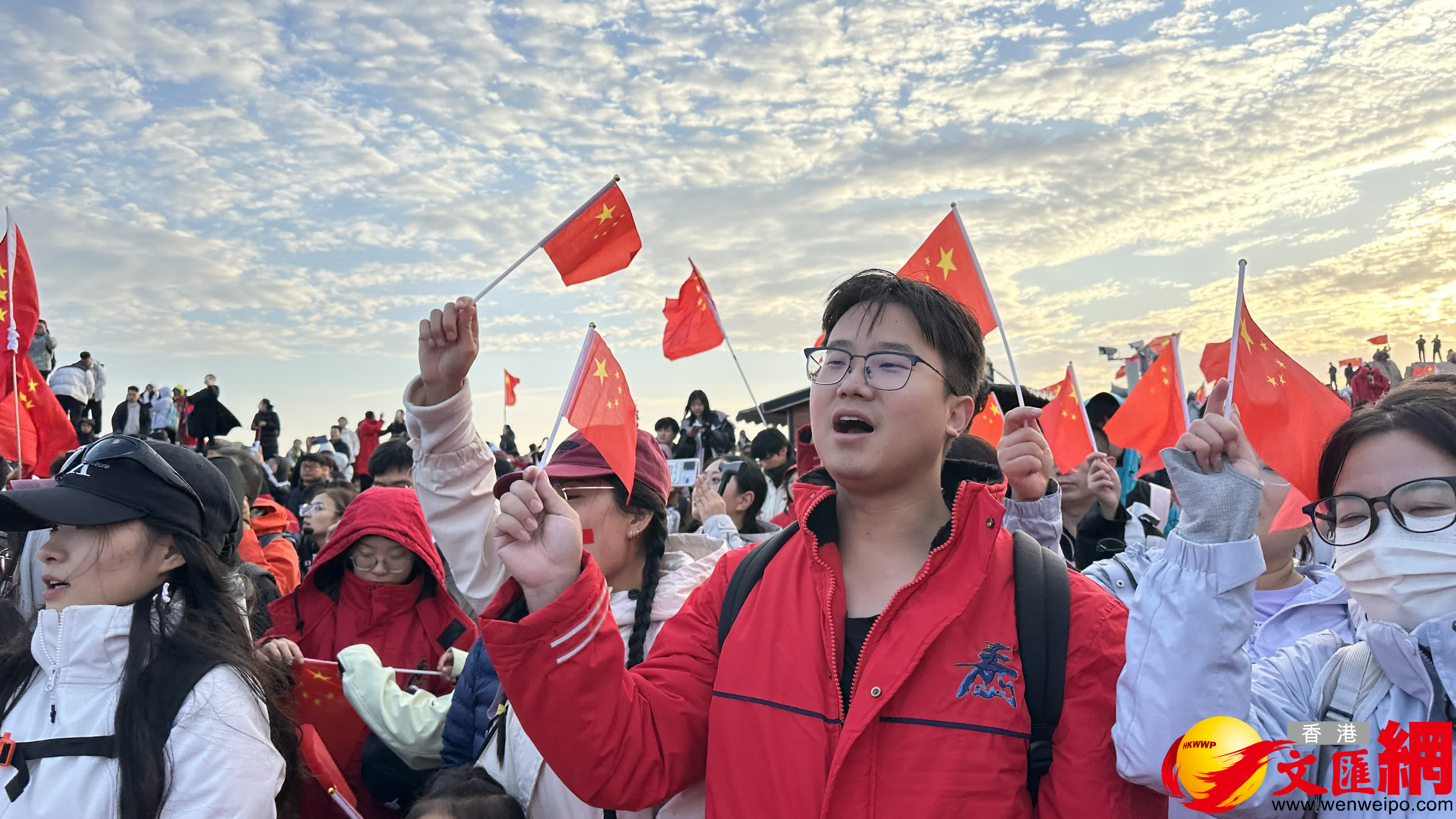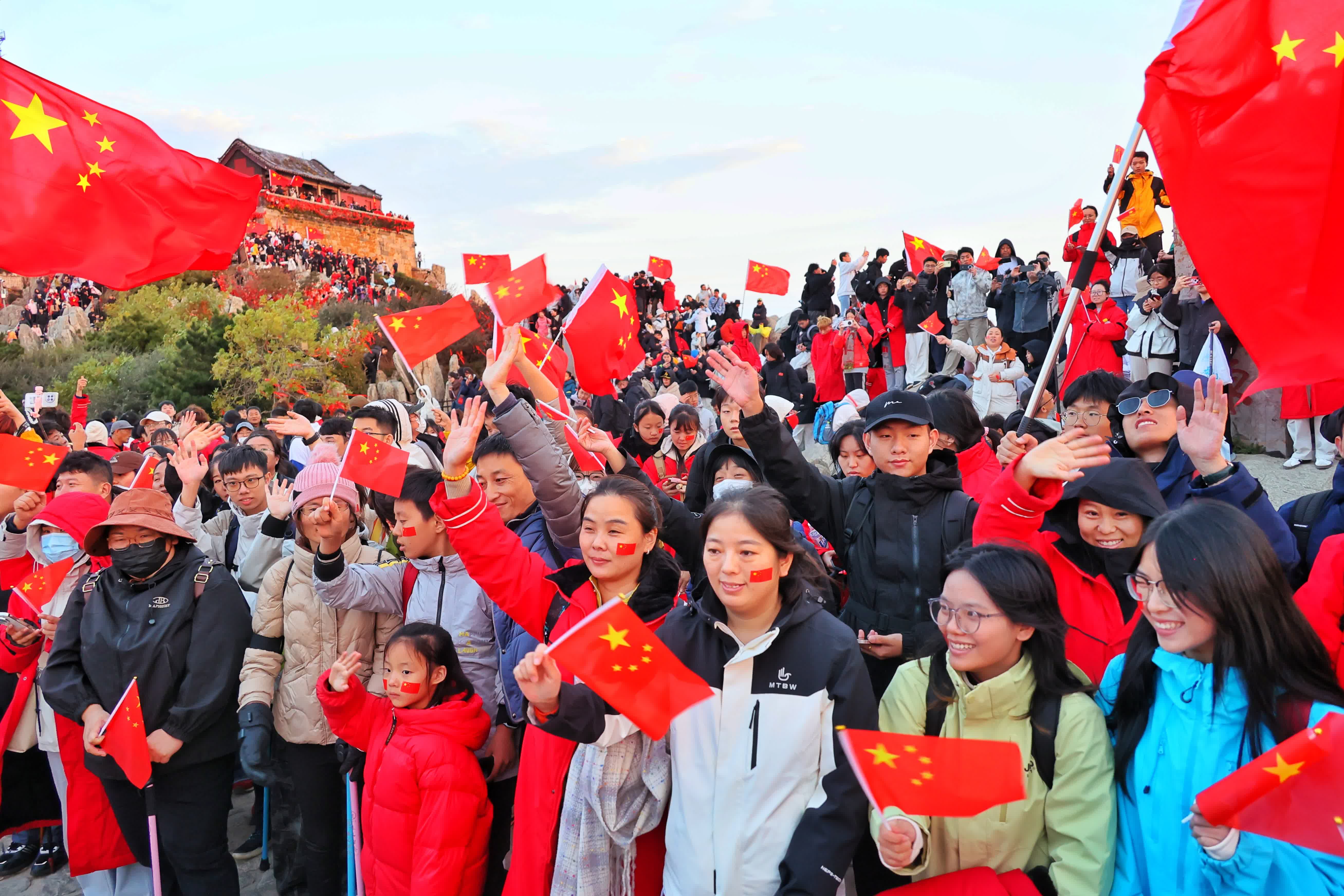 (香港文匯網記者丁春麗 泰安報道)10月1日凌晨6時許,1.3萬名遊客齊聚泰山之巔,以升國旗、賞日出、唱愛國歌曲的方式共慶祖國華誕,漫山揮舞的國旗與紅日、朝霞相映,成為泰山上最耀眼的色彩。