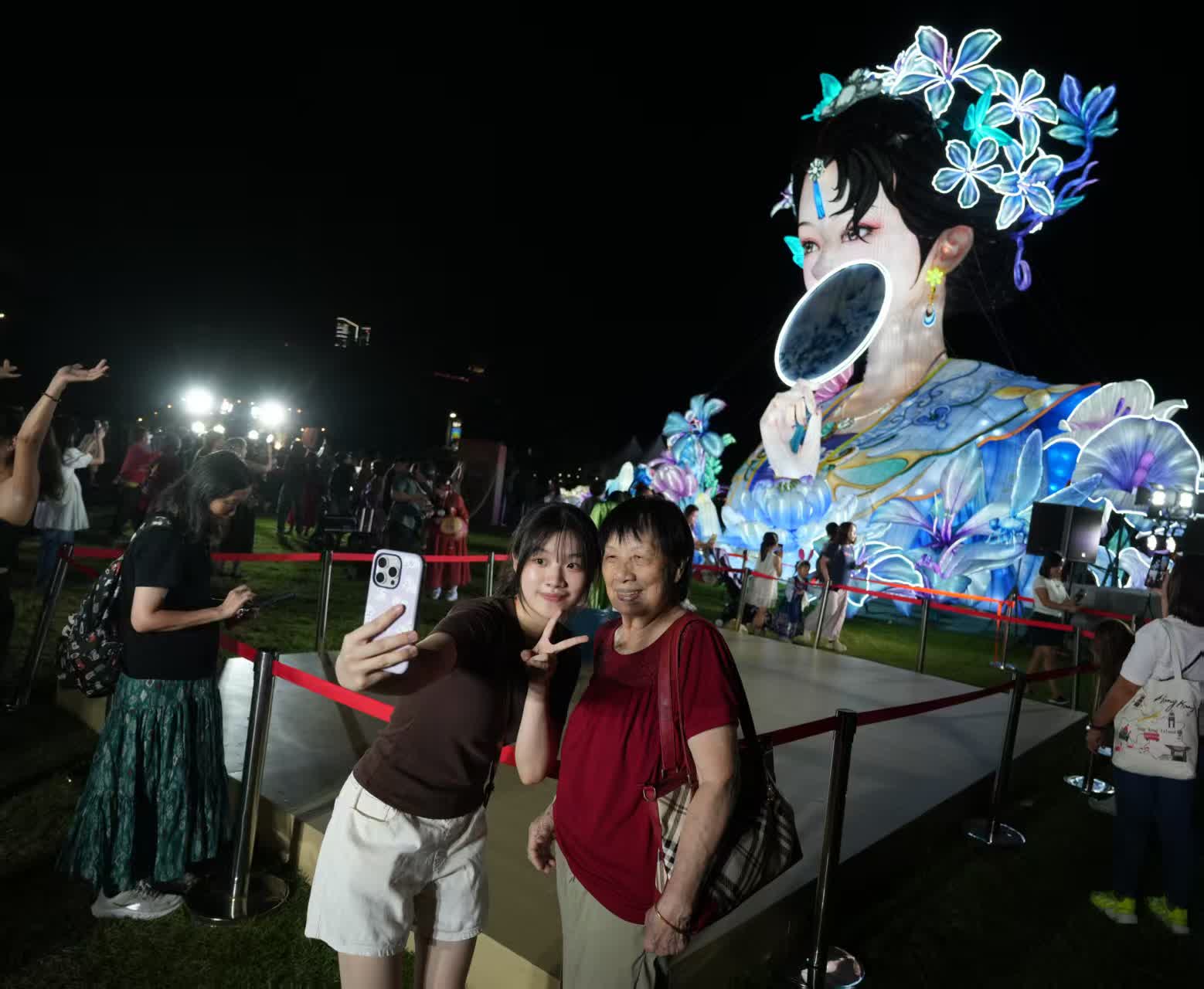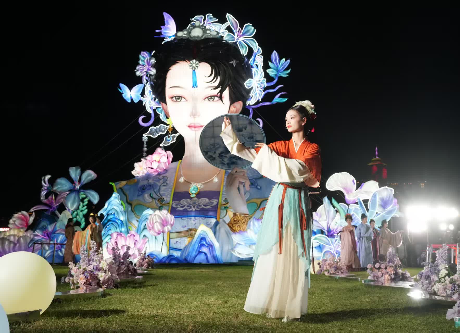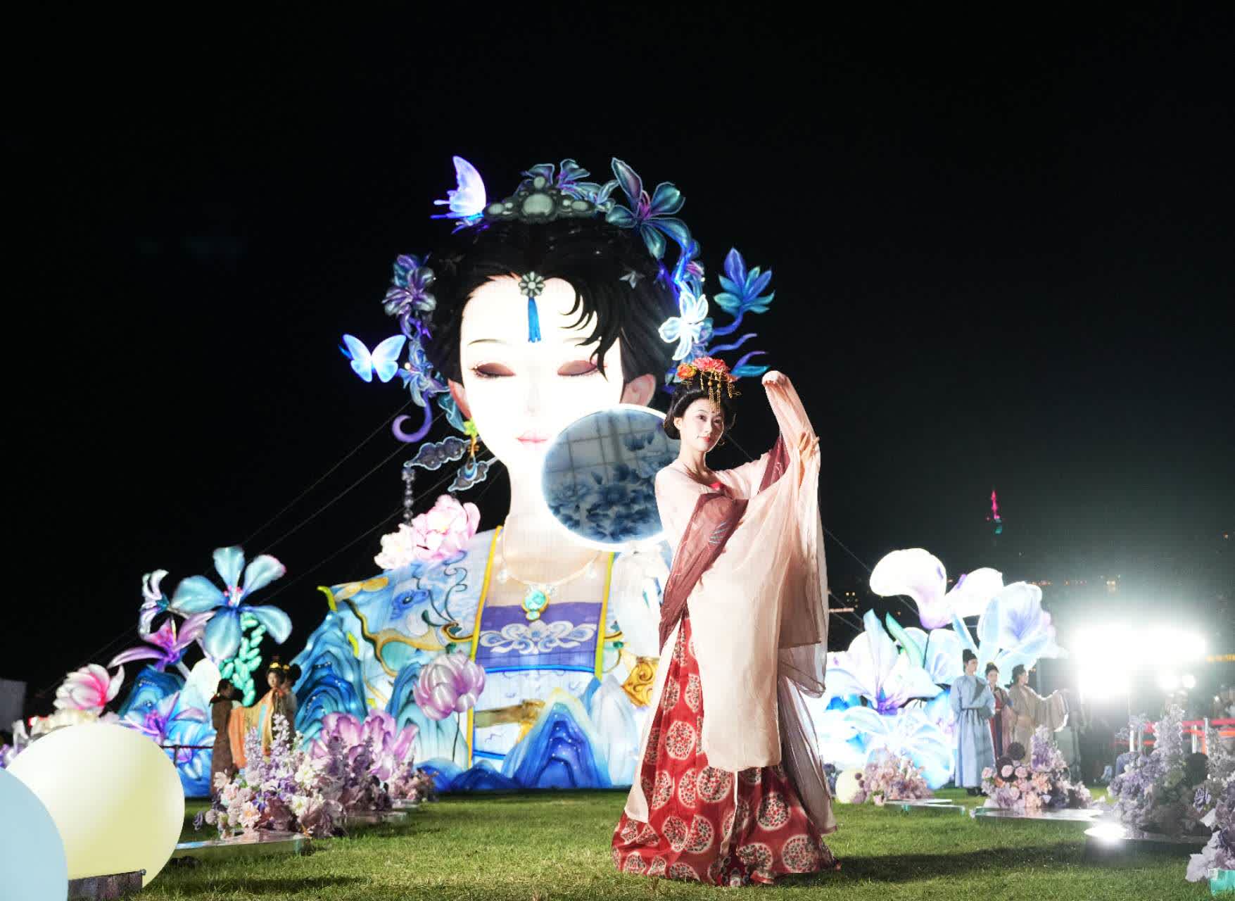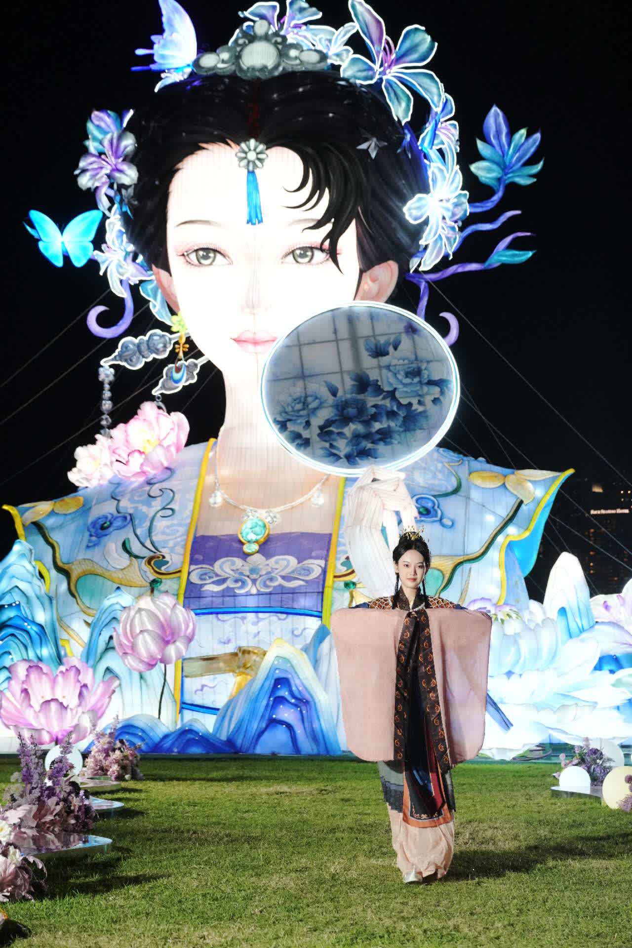 沿維港岸邊漫步,最醒目的莫過於「香江仙子」花燈組。主燈「紫霞仙子」高12.8米,由四川自貢花燈匠人歷時半年打造,是香港迄今展出過的最大單體人物花燈。以紫荊花為靈感,裙裾間點綴牡丹與錦繡,寓意國泰民安、花開富貴。亮燈後,花燈前很快聚滿人群,不少市民和遊客拍照留念,成為現場最受歡迎的打卡點。與之相映的「國色凝香」「錦裳荷影」「芙韻江山」等主題燈景,將花神文化、節氣意象與江山圖景融為一體,為國慶夜色增添浪漫氣息。