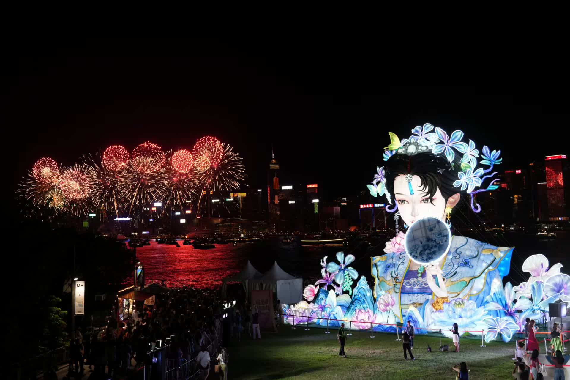 夜幕低垂,煙花秀點亮維港上空,與「紫霞仙子」主燈交相輝映。煙花以紅色為主,輔以黃色和綠色,綻放出大拇指、笑臉、愛心等奇特形狀,吸引不少市民早早到二樓佔位,只為同時捕捉花燈與煙花的絕佳角度。當最後一輪煙花盛放時,全場響起一片驚呼,將整晚氣氛推向高潮。