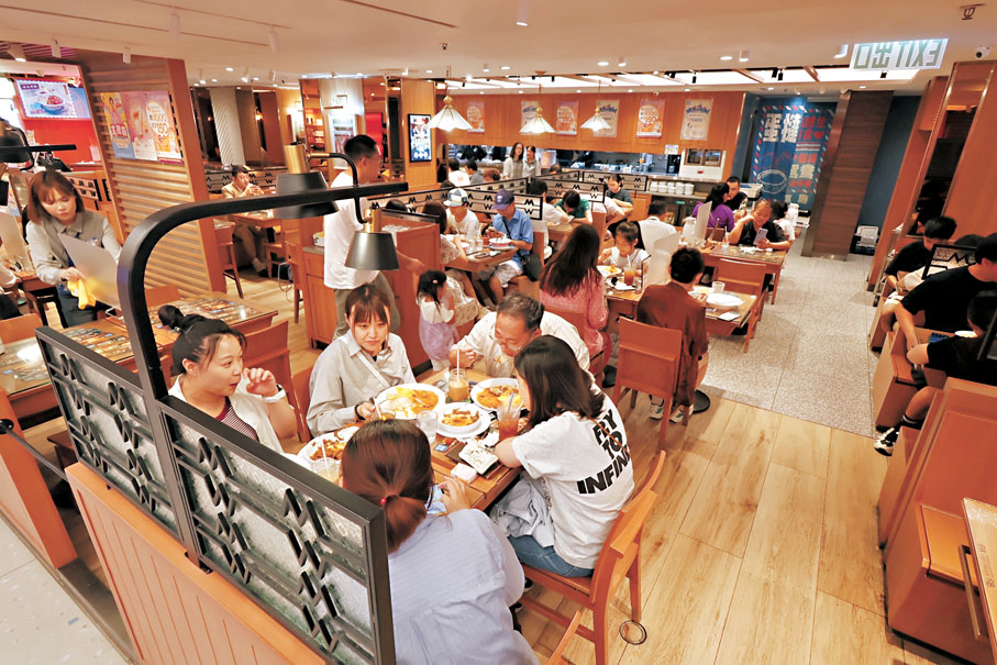 多個連鎖餐飲集團也參與國慶日的優惠活動,旗下多間食肆提供全日全單七折優惠,而除食肆外,不少酒店中午及晚上的自助餐也有七折活動,不少市民專程前往消費。香港文匯報記者昨日中午在尖沙咀新太陽廣場直擊,商場內兩間相鄰的海南雞餐廳及茶餐廳,因推出七折優惠而門庭若市。