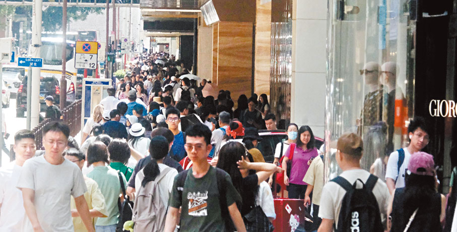 一連8天的內地國慶黃金周長假期昨日展開,大批旅客來港旅遊及消費,全港各區不同旅遊景點、博物館、食肆、商場、馬場隨處可見「食、買、玩」的內地客蹤影。香港特區政府入境處表示,截至晚上9時,48萬多人次入境,內地旅客佔22.4萬多人次,較去年同期增約5%;落馬洲支線是最多人使用的入境口岸,有8.8萬人次。數據顯示,最多內地客經高鐵西九龍站來港,有逾5.5萬人次。香港文匯報記者昨日上午到高鐵站直擊,當時已擠滿入境旅客,不少更是來自福建、湖南等廣東省以外的長途旅客,亦有不少旅行團抵達。雖然隨着旅客出行模式轉變,愈來愈多內地旅客更欲深度探索不一樣的香港,但尖沙咀廣東道一帶名店依然生意暢旺,店外湧現長長的排隊人龍,藥妝店亦擠滿選購熱門商品的旅客。●香港文匯報記者 李芷珊、張茗