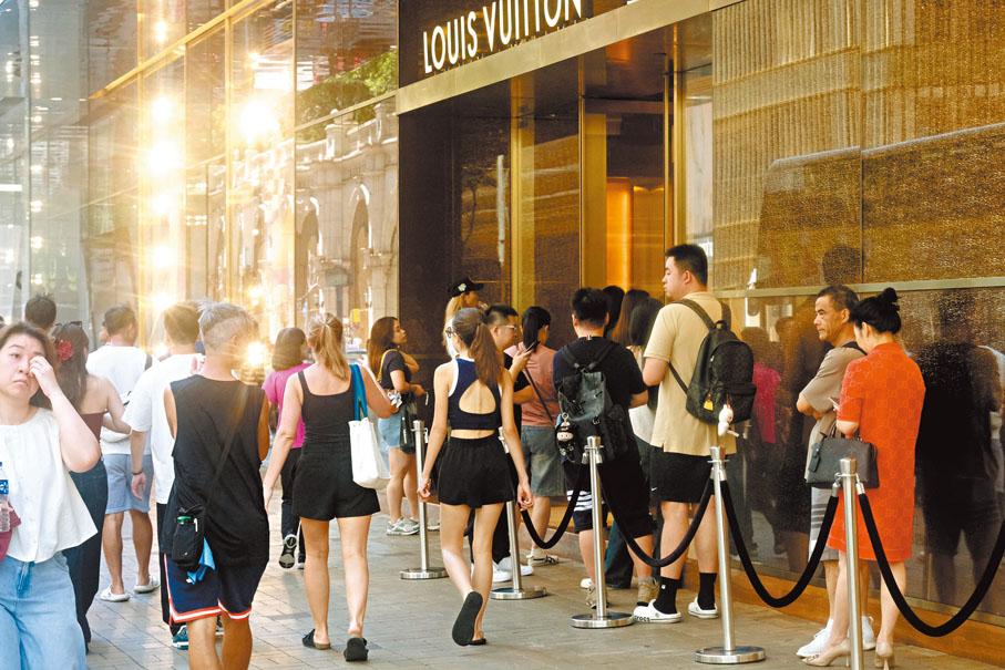 廣東道一帶同樣遊人如織,部分名店外出現排隊人龍,藥妝店內也有不少旅客選購商品。來自浙江的旅客與朋友來港3天,其中一個行程便是到廣東道名店購物。她說:「會隨心選購,看到喜歡的就購買,並無設定預算。」湖南旅客陳女士則專程前來選購手袋等名牌商品,預計消費約5萬元。