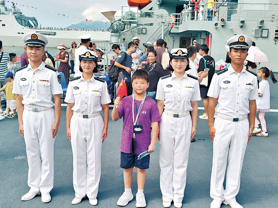 9歲的歐陽小朋友驕傲地說,這次是他第3次參觀軍艦,可惜的是因為年齡關係,他不能登上山東艦航母,只能參觀湛江艦和運城艦。不過這次參觀軍艦,他首次與4位兵哥哥和兵姐姐合照,覺得大家都很熱情,而且很有型,「兵哥哥很帥,兵姐姐也很漂亮。」