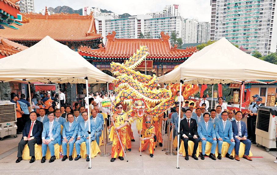 香港文匯報訊 今年是中華人民共和國成立76周年,同時是嗇色園即將踏入105周年紀慶,嗇色園昨日在黃大仙祠內的財神宮平台舉行國慶升旗禮及黃大仙祠開放日開幕禮。