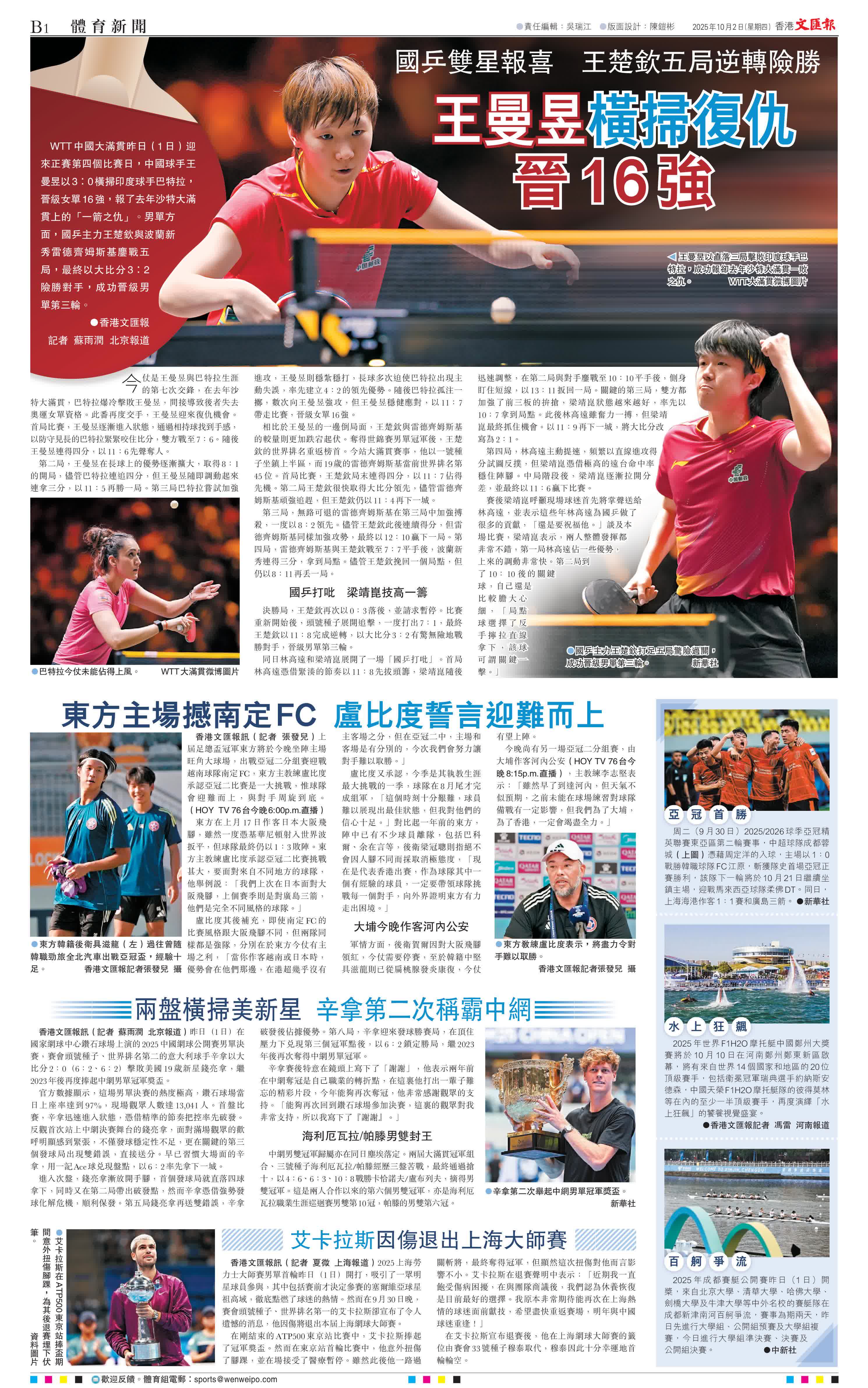 (香港文匯報記者 蘇雨潤 北京報道)WTT中國大滿貫昨日(1日)迎來正賽第四個比賽日,中國球手王曼昱以3:0橫掃印度球手巴特拉,晉級女單16強,報了去年沙特大滿貫上的「一箭之仇」。男單方面,國乒主力王楚欽與波蘭新秀雷德齊姆斯基鏖戰五局,最終以大比分3:2險勝對手,成功晉級男單第三輪。