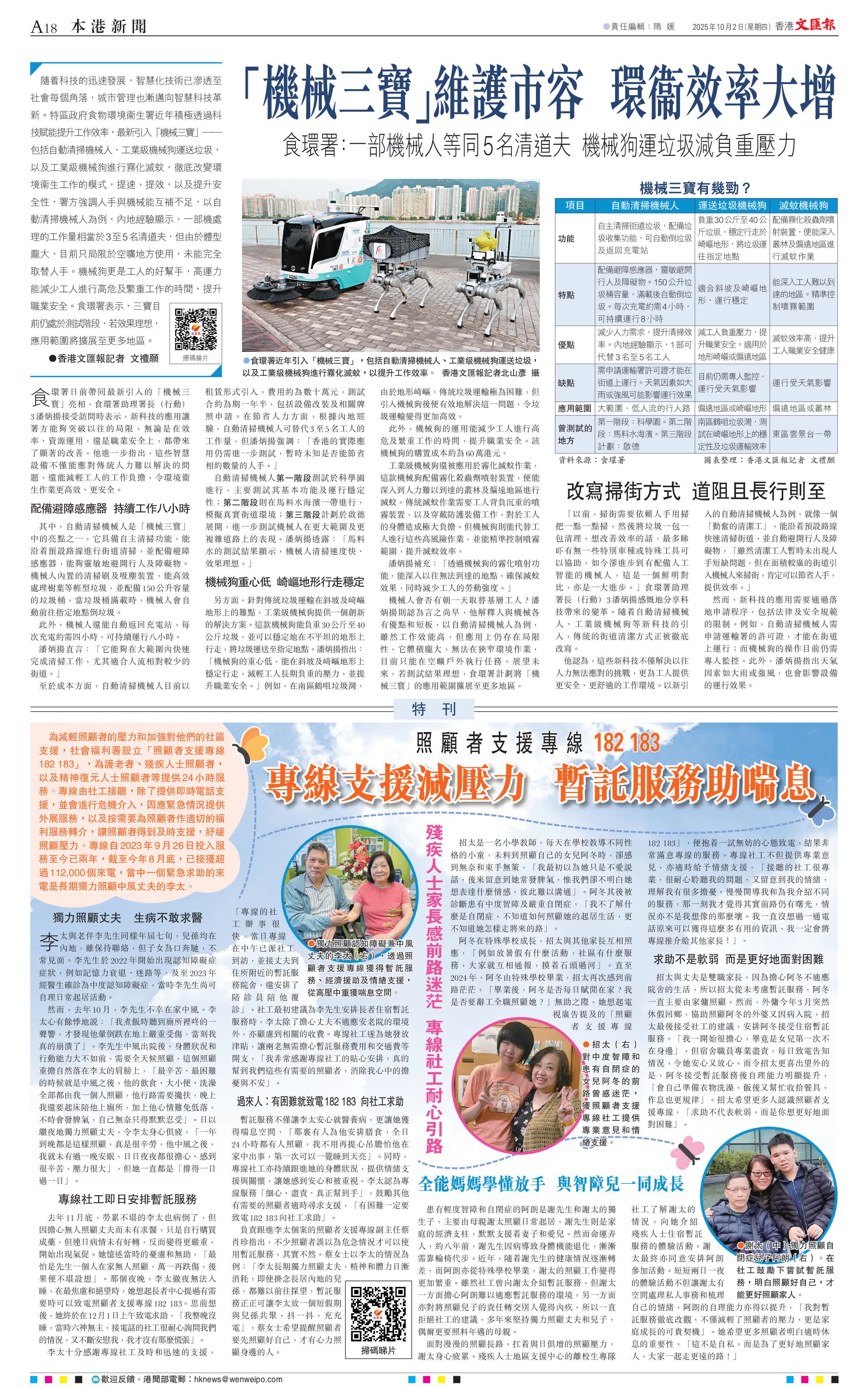 (香港文匯報記者 文禮願)隨着科技的迅速發展,智慧化技術已滲透至社會每個角落,城市管理也漸邁向智慧科技革新。特區政府食物環境衞生署近年積極透過科技賦能提升工作效率,最新引入「機械三寶」——包括自動清掃機械人、工業級機械狗運送垃圾,以及工業級機械狗進行霧化滅蚊,徹底改變環境衞生工作的模式,提速、提效,以及提升安全性,署方強調人手與機械能互補不足,以自動清掃機械人為例,內地經驗顯示,一部機處理的工作量相當於3至5名清道夫,但由於體型龐大,目前只局限於空曠地方使用,未能完全取替人手。機械狗更是工人的好幫手,高運力能減少工人進行高危及繁重工作的時間,提升職業安全。食環署表示,三寶目前仍處於測試階段,若效果理想,應用範圍將擴展至更多地區。