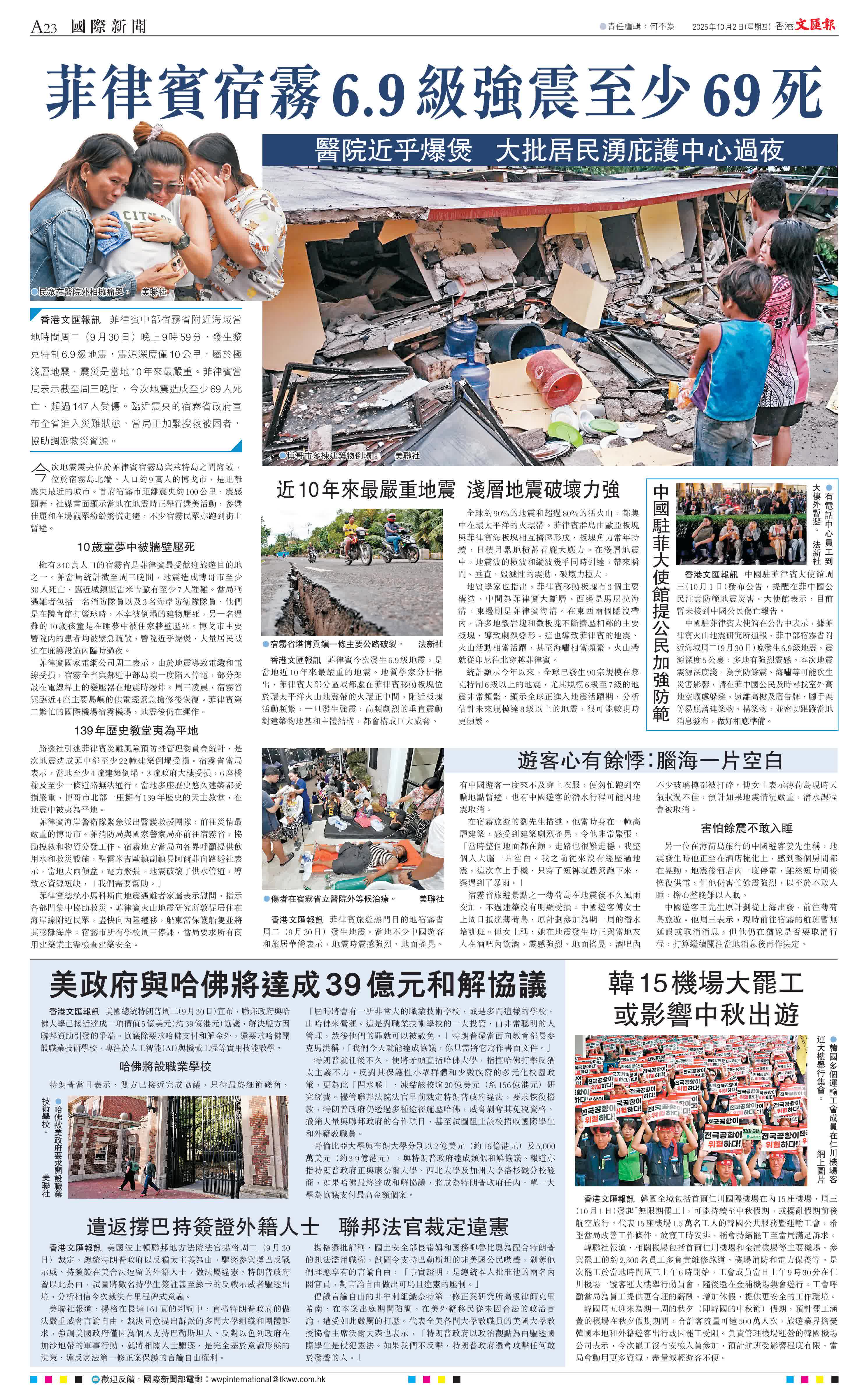 香港文匯報訊 菲律賓中部宿霧省附近海域當地時間周二(9月30日)晚上9時59分,發生黎克特製6.9級地震,震源深度僅10公里,屬於極淺層地震,震災是當地10年來最嚴重。菲律賓當局表示截至周三晚間,今次地震造成至少69人死亡、超過147人受傷。臨近震央的宿霧省政府宣布全省進入災難狀態,當局正加緊搜救被困者,協助調派救災資源。