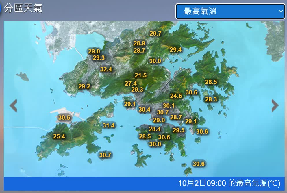 高溫天氣持續。本港今早9時許,多處已錄得逾30.0度氣溫,、元朗公園32.6度、大埔30.2度、西貢30.6度、深水埗30.7度、跑馬地30.6度、、跑馬地30.7度等。天文台提醒巿民,高溫天氣持續,請補充足夠水分。如感不適,立刻休息或求助,需要時儘快求醫。