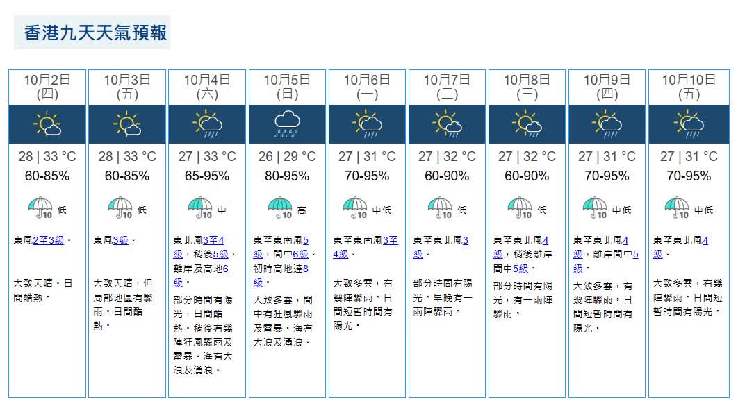展望本港明日(3日、星期五)大致天晴,但局部地區有驟雨,日間酷熱,氣溫介乎28至33度。星期六(4日)部分時間有陽光,日間酷熱,稍後有幾陣狂風驟雨及雷暴。海有大浪及湧浪。氣溫介乎27至33度。至星期日(5日)大致多雲,間中有狂風驟雨及雷暴,海有大浪及湧浪,氣溫介乎26至29度。中秋節及翌日天色逐步好轉。