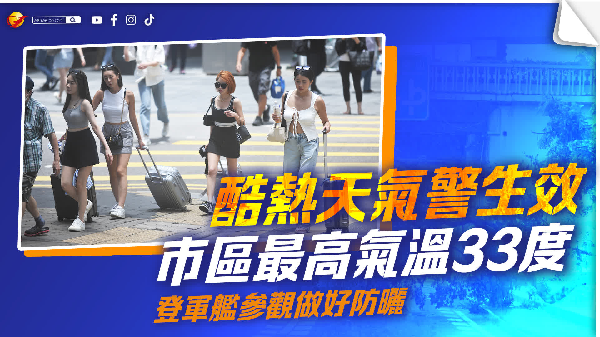 香港文匯報訊 酷熱天氣警告現正生效,慎防中暑,避免長時間在戶外活動,要充分喝水。天文台指,高空反氣旋正為華南帶來普遍晴朗的天氣。本港地區今日(2日)天氣預測大致天晴,日間酷熱,市區最高氣溫約33度,新界再高一兩度,吹輕微至和緩偏東風。日間又曬又熱,今日預約登軍艦參觀,記得做好防曬及防暑熱措施啊!