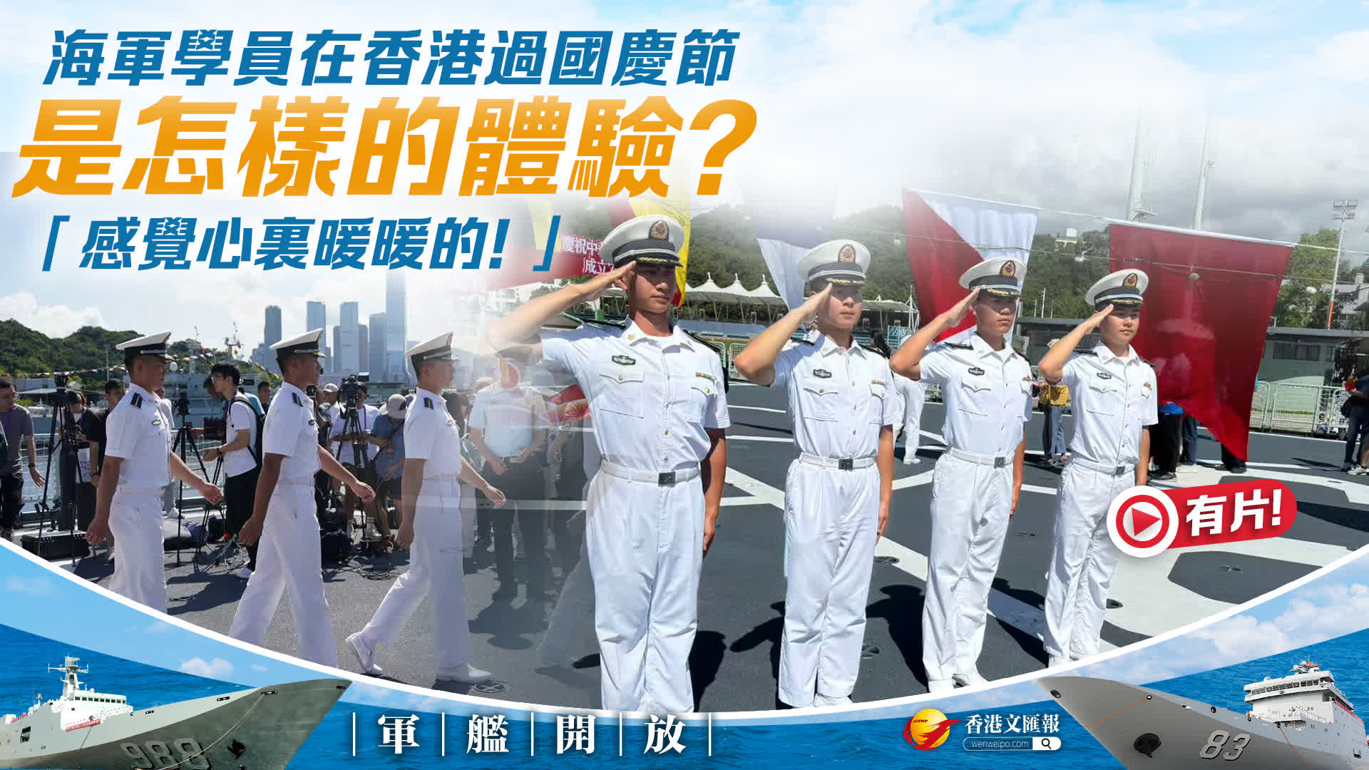 由海軍戚繼光艦、沂蒙山艦組成的83艦編隊今日(10月2日)繼續在昂船洲軍營舉辦艦艇開放活動,吸引大量香港市民到場參與。在接受傳媒採訪時,海軍大連艦艇學院學員程嘉銘與張子涵分享了在香港歡度國慶節的體驗,他們特別提到對維港國慶煙花和香港街頭的紅旗旗海印象深刻。