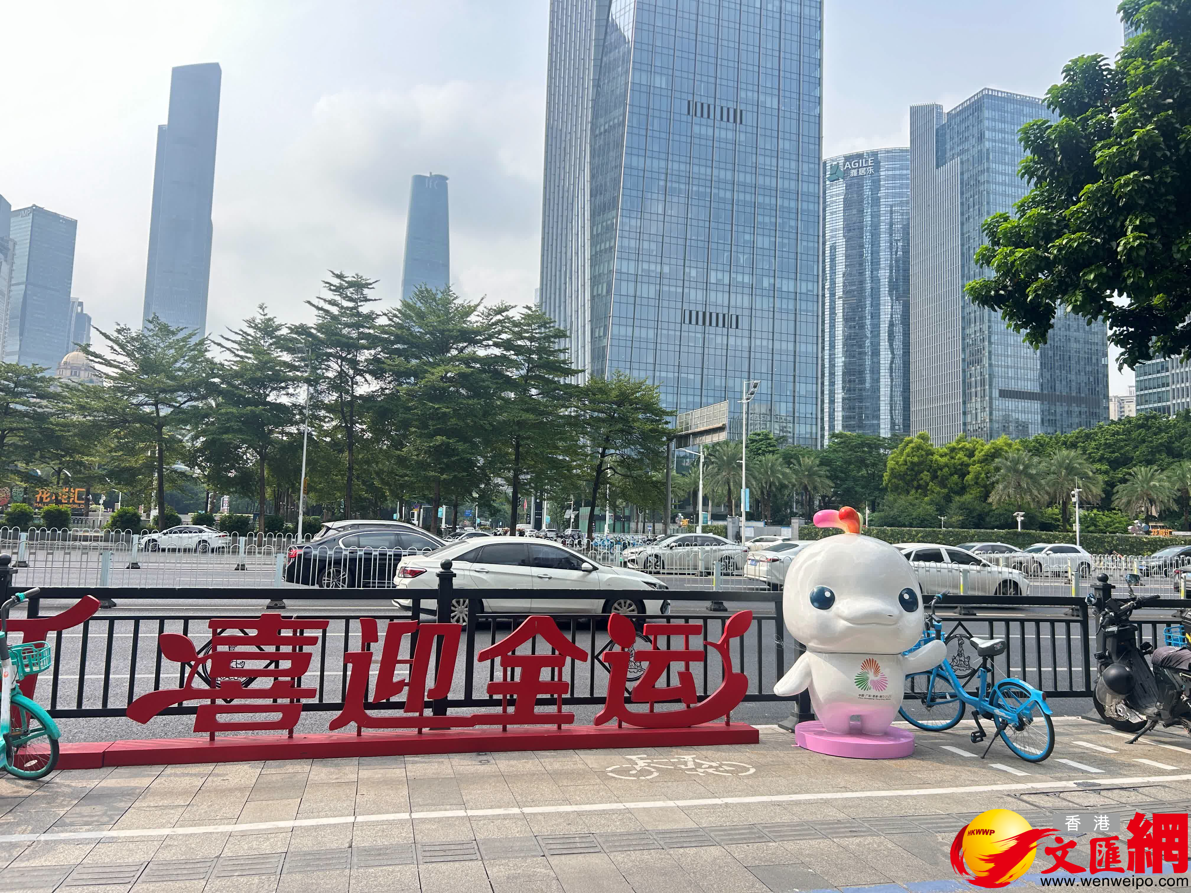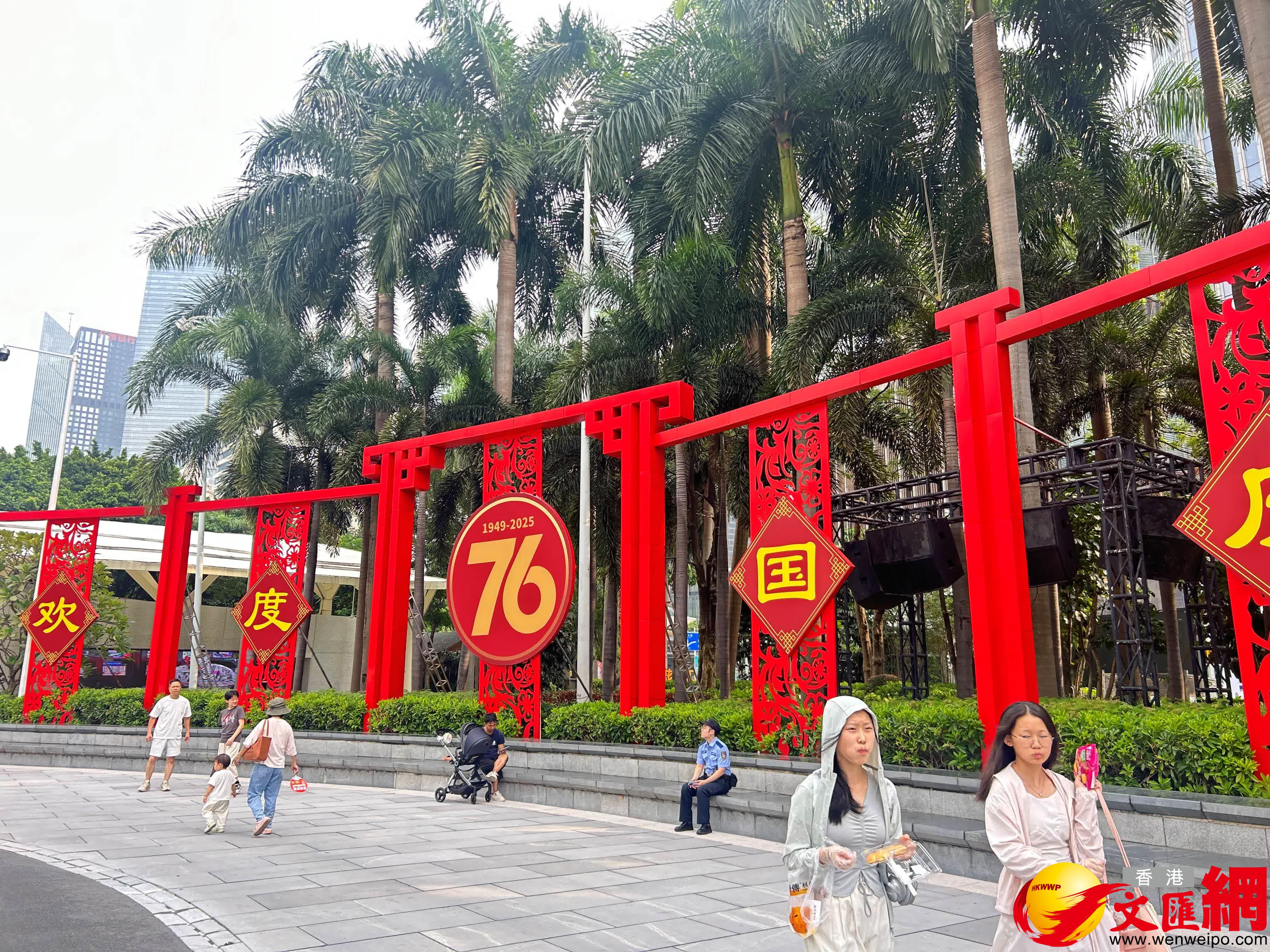 今年恰逢全運年,國慶期間,「中國紅」與全運元素搭配,進一步扮靚了羊城。記者在廣州天河商圈看到,「激情全運會,活力大灣區」 「追夢大灣區,出彩人生路」的主題口號在廣州中軸線各路口、地鐵1號線展廳電子大屏、商業大樓幕牆等地隨處可見,十五運會和殘特奧會吉祥物「喜洋洋」和「樂融融」的文創作品放置在街頭巷尾,小區公園、社區健身處等地,市民紛紛前來合影打卡。
