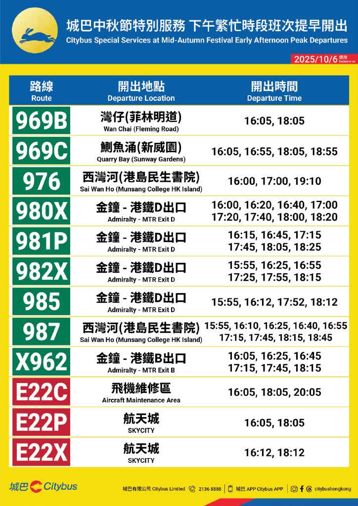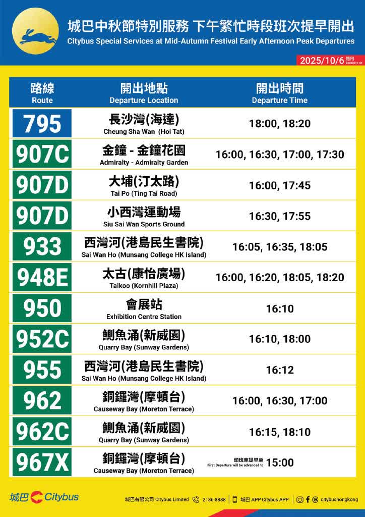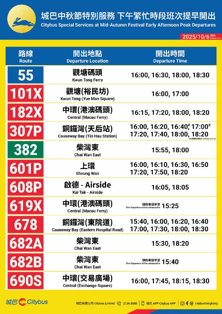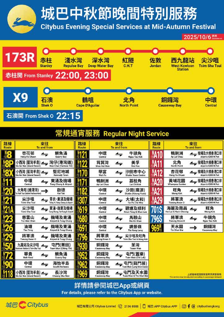 香港文匯報訊(記者 蕭景源)城巴將於中秋節(10月6日)加強服務,協助顧客外出賞月及歸家團圓。城巴特別設有兩條熱門賞月景點路線:173R號線將由赤柱開出,接駁佐敦及尖沙咀;X9號線則由石澳開出,接駁北角、銅鑼灣及中環;近40條常規通宵路線亦會按需求加強服務。此外,中秋節當日下午的繁忙時段班次將提早開出,以助顧客放早後更便捷歸家團圓。