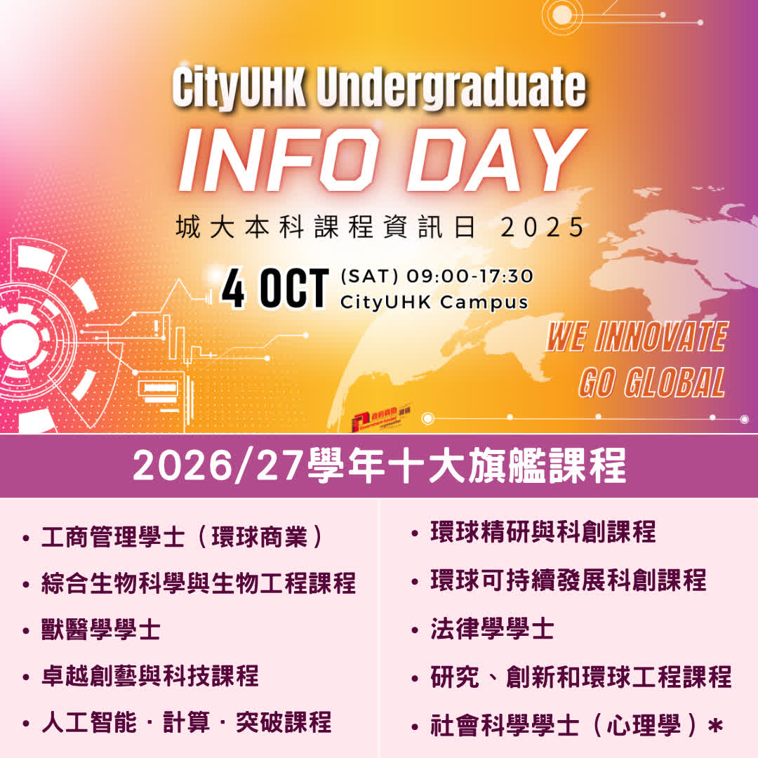 香港文匯報訊(記者 莫楠)香港城市大學將於10月4日在九龍塘校園舉辦本科課程資訊日。城大在本學年將開辦超過100個課程,共設近3,000個聯招與非聯招學額,資訊日將舉行超過200場活動,其中包括聯招及非聯招入學講座,各學院及學系亦會舉辦課程簡介會升學諮詢、主題展覽、校園導賞,以及學生與校友的經驗分享,涵蓋最新課程資訊、入學要求、學生分享及升學規劃建議,讓中學生及家長全面了解城大的教學特色及多元學習環境,及早規劃升學路向。