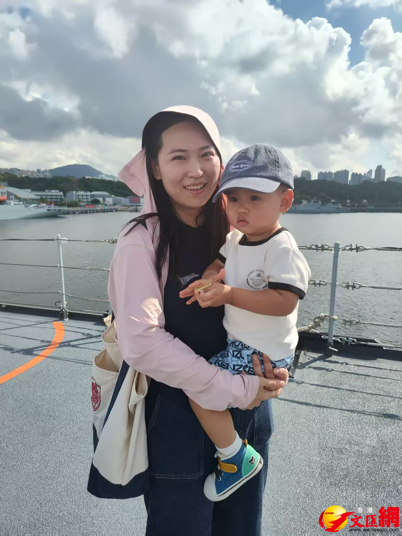 港漂王小姐今日帶着1歲半的兒子登上沂蒙山艦,她告訴香港文匯報記者,她是特意請假帶兒子過來參觀,「我覺得孩子現在差不多能自己走路了,也能看懂一些事物,就想帶他來感受一下祖國的力量。」她覺得孩子有這樣的體驗,是一件很好的事。