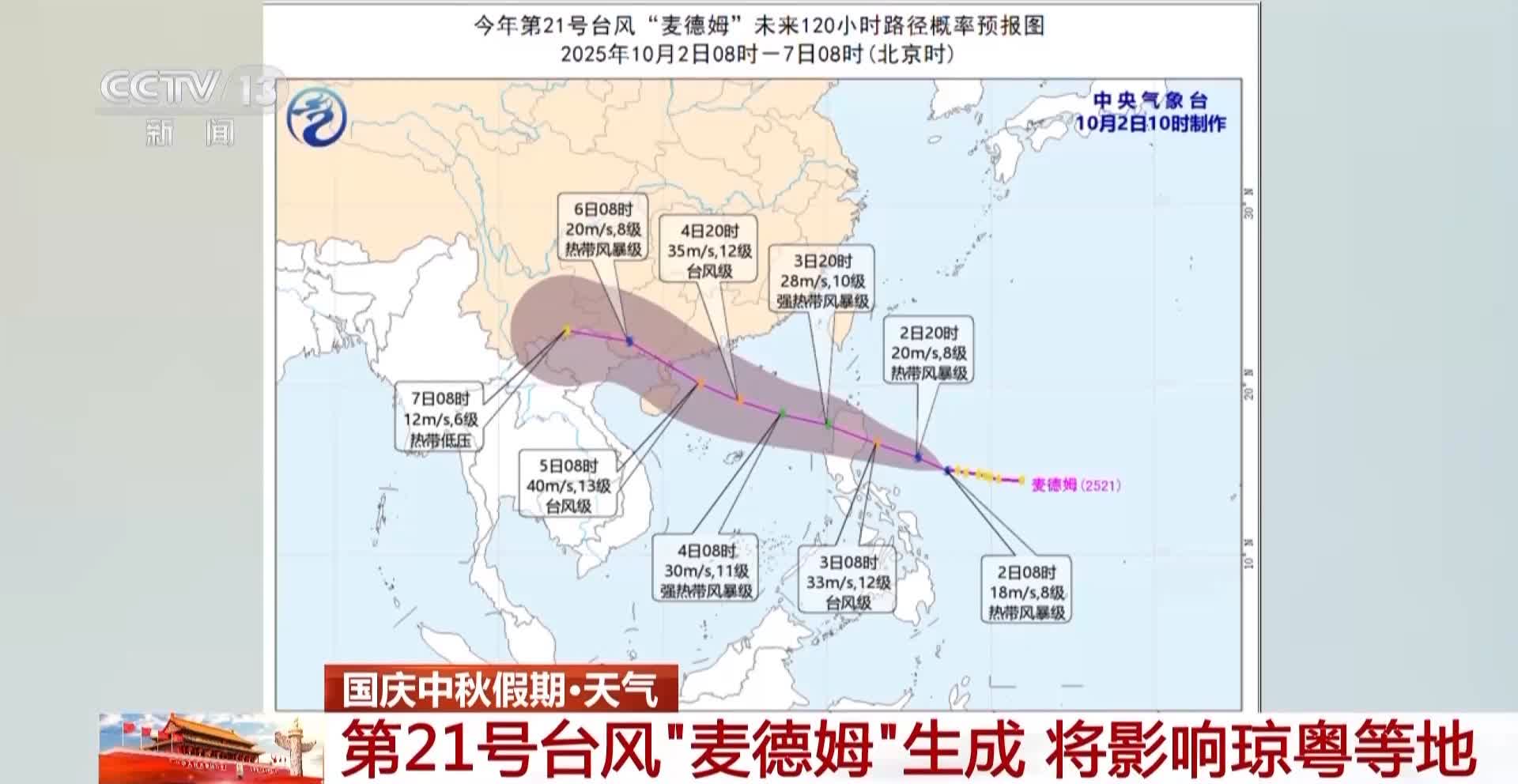 中央氣象台預報顯示,菲律賓以東洋面的熱帶低壓已於今天上午加強為今年第21號颱風「麥德姆」,今天11時,其中心位於距離菲律賓馬尼拉偏東方向約620公里的海面上,中心附近最大風力有8級,強度為熱帶風暴級。